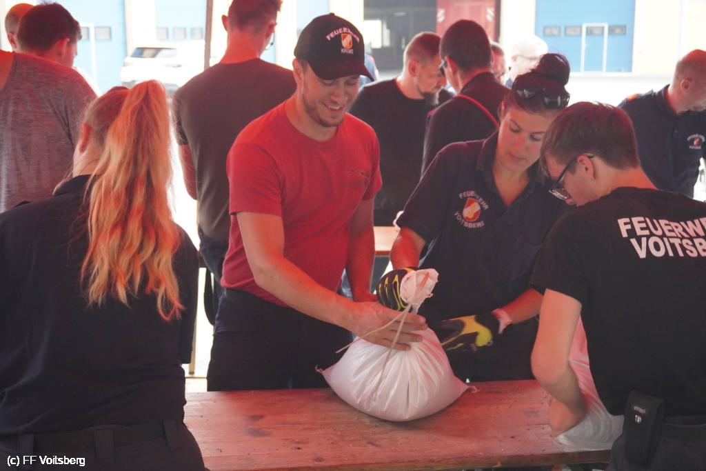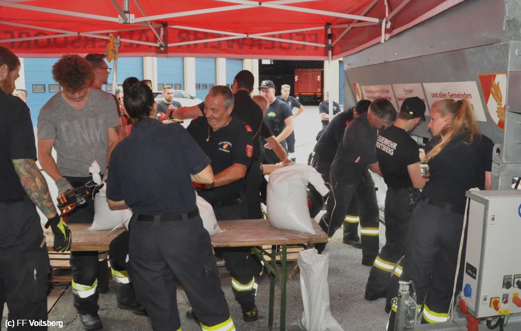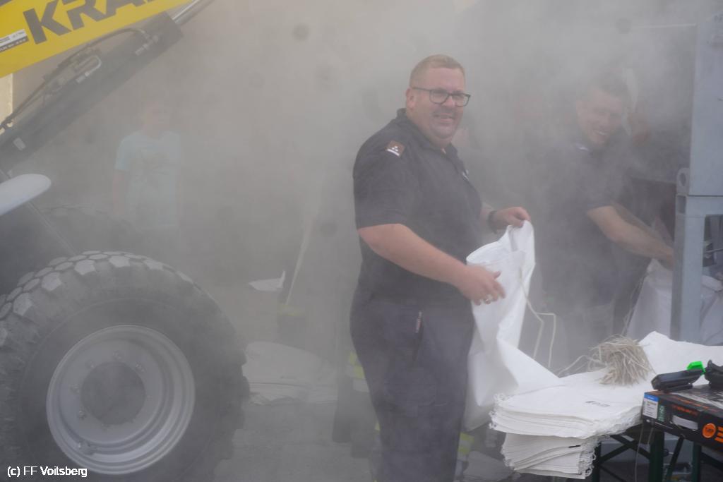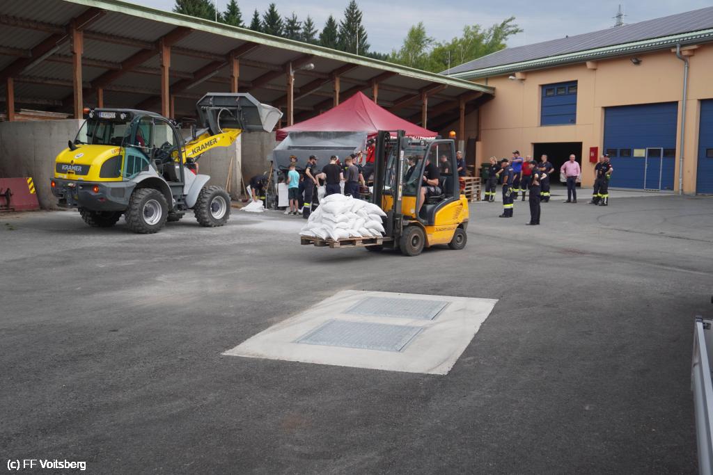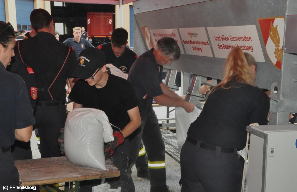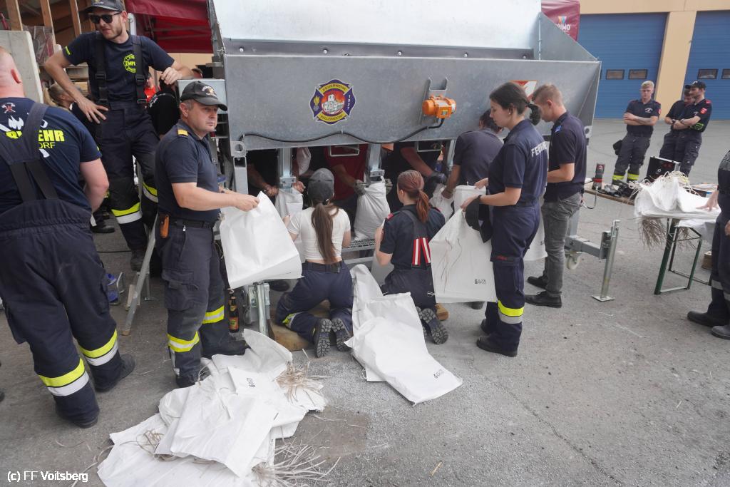 43 Personen aus den Feuerwehren Voitsberg und Krems, Mitarbeiter des städtischen Bauhofes Voitsberg sowie KameradInnen der FF Hallersdorf, welche für den BFV Voitsberg der Katastrophenstützpunkt ist, füllten am 17. Juni 2024 am Bauhof in Voitsberg tausende Sandsäcke mit der Sandsackfüllanlage für die Voitsberger Bevölkerung ab, um den Bewohnern die Möglichkeit zu geben, sich selbst vor Hochwasser zu schützen. Jeder kann bis zu 10 Sandsäcke gratis erwerben, bei sich lagern und im Unwetterfall Erstmaßnahmen von selbst setzen.