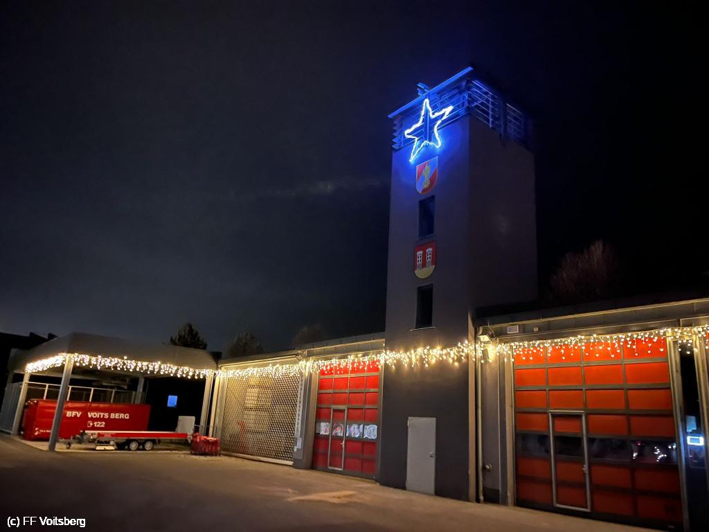 VOITSBERG, am 29.11.2024 Seit 29.11.2024 Abend erstrahlt das Feuerwehrhaus der Stadtfeuerwehr Voitsberg im weihnachtlichen Glanz.