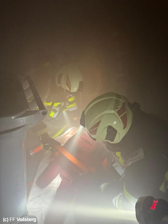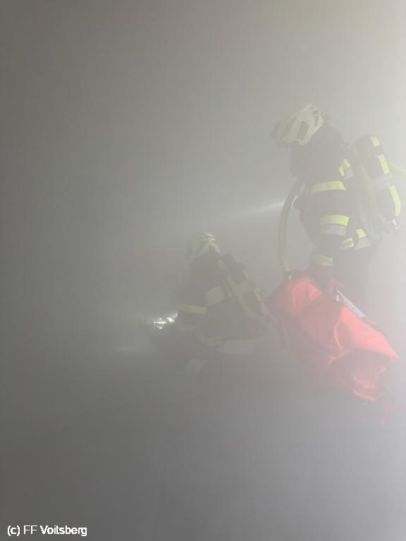 Ein Atemschutztrupp des HLF 4 Voitsberg rüstete sich umgehend zur Menschenrettung aus und konnte nach kurzer Zeit den vermissten Arbeiter in der stark verrauchten Lagerhalle auffinden und ins Freie bringen. Weiters wurde gleichzeitig mit zwei C-Löschleitungen das Bürogebäude vor dem Übergreifen der Flammen geschützt.