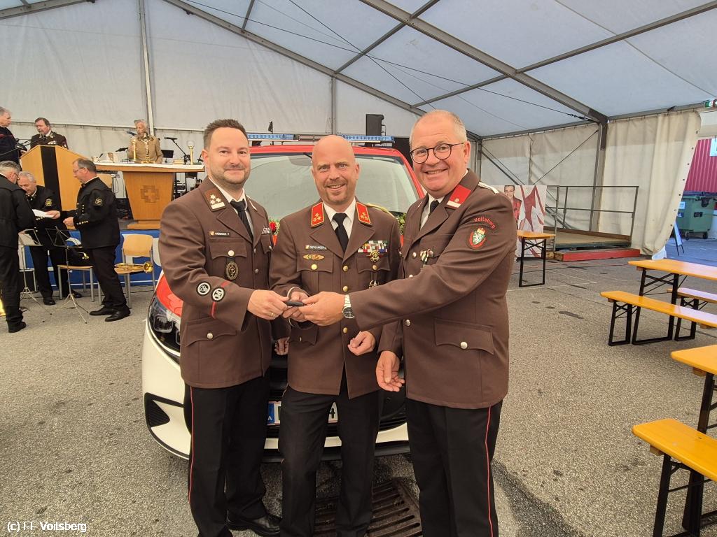 In ihren Ansprachen bedankten sich HBI DI (FH) Bernd Unger und unser Maschinenmeister HLM d. F. Peter Kremaucz beim Bürgermeister und Landesfeuerwehrverband für die finanzielle Unterstützung bei der Finanzierung. Im Anschluss an die Segnung erfolgte die symbolische Übergabe des Fahrzeugschlüssels.