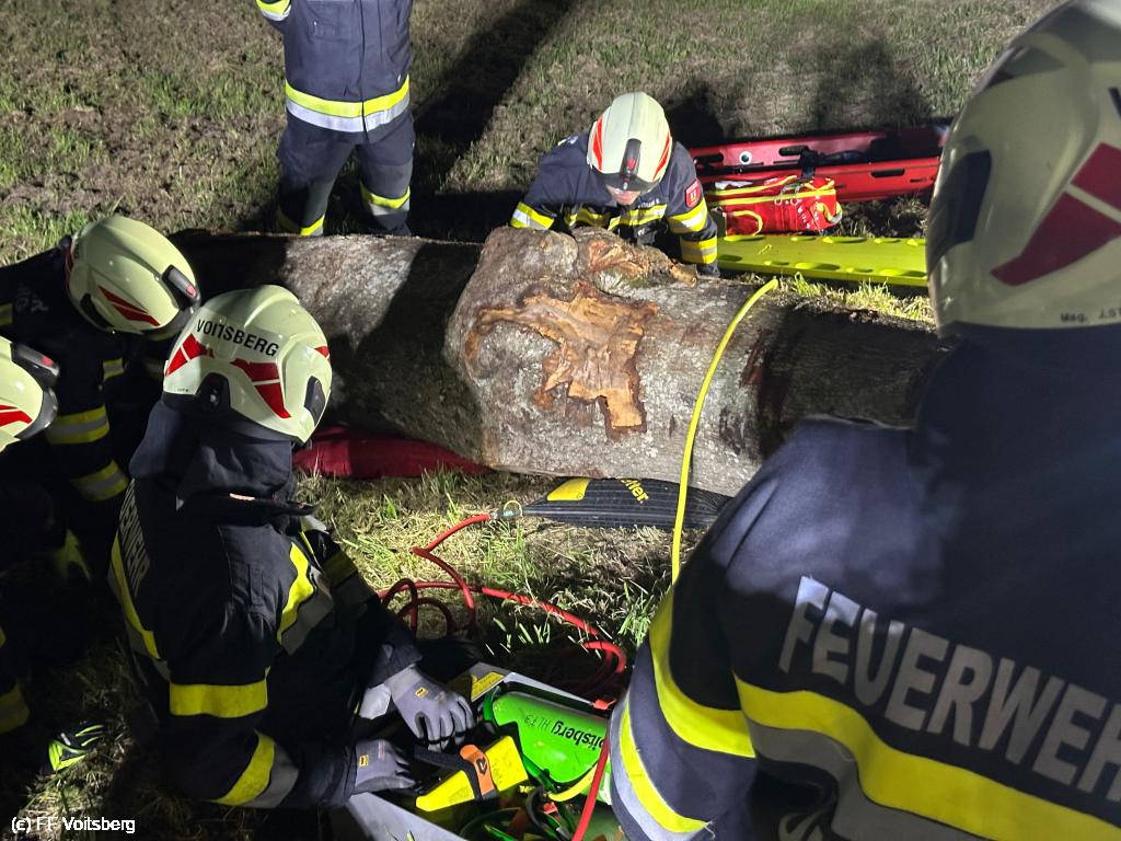 Ein verletzter Arbeiter wurde von einem umfallenden Baumstamm getroffen und darunter eingeklemmt.