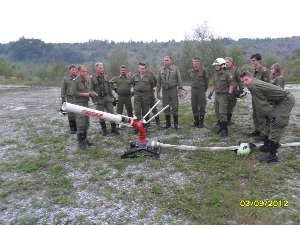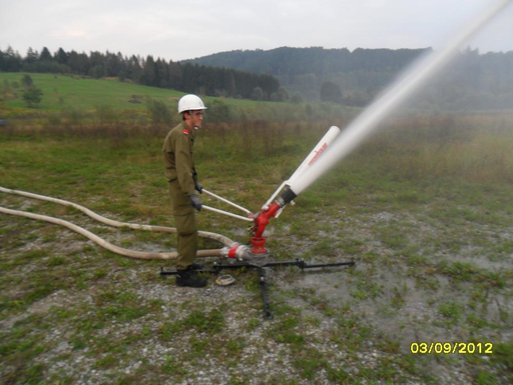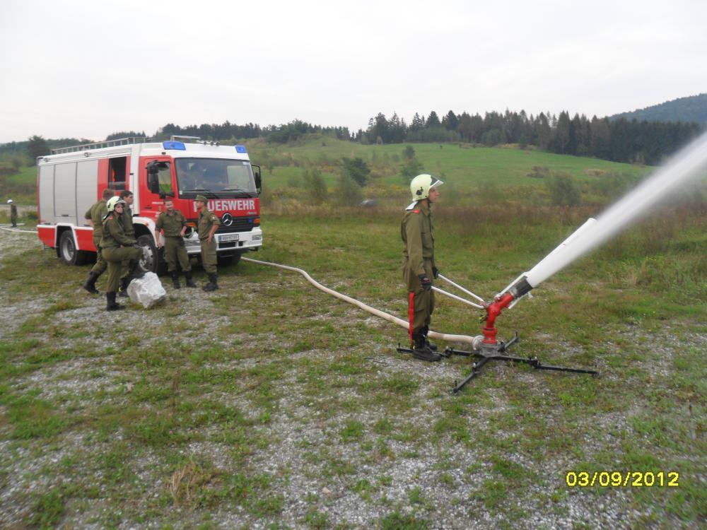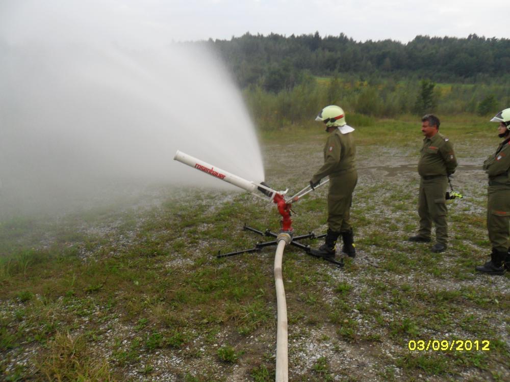 VOITSBERG, am 03.09.2012 Im ehemaligen Bergbaugelände Zangtal wurde eine Ausbildungsübung zum Thema „Waldbrandbekämpfung“ durchgeführt. BM Bernd Unger erklärte den optimalen Einsatz einer Tragkraftspritze. Die taktisch richtige Verwendung von C-Rohr, B-Rohr und Wasserwerfer bei der Waldbrandbekämpfung in Hinblick auf die Aufbringung von Löschwasser und die Deckungsbreite der Strahlrohre wurde ebenfalls erklärt. Im praktischen Teil wurde die Kombination Tragkraftspritze mit Wasserwerfer auf Lafette beübt.