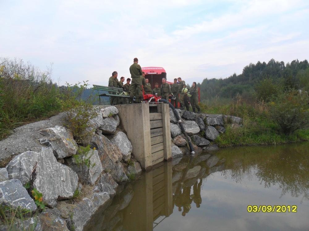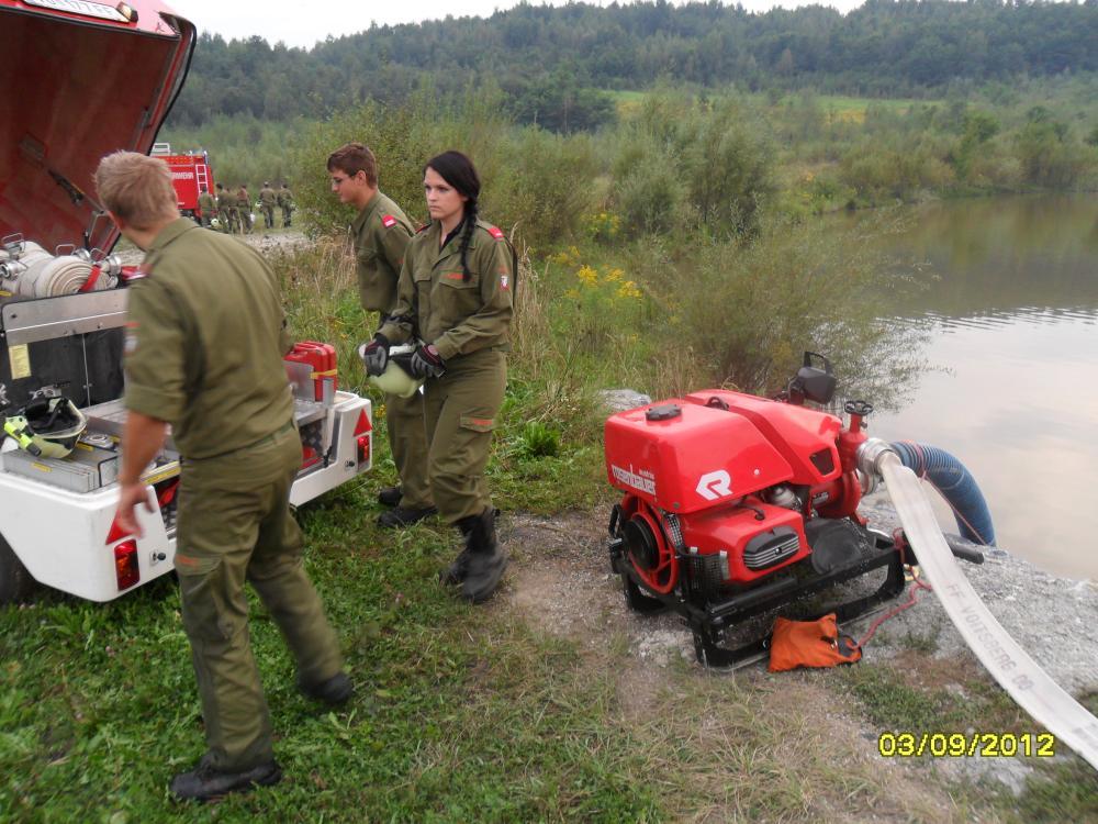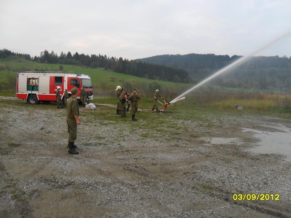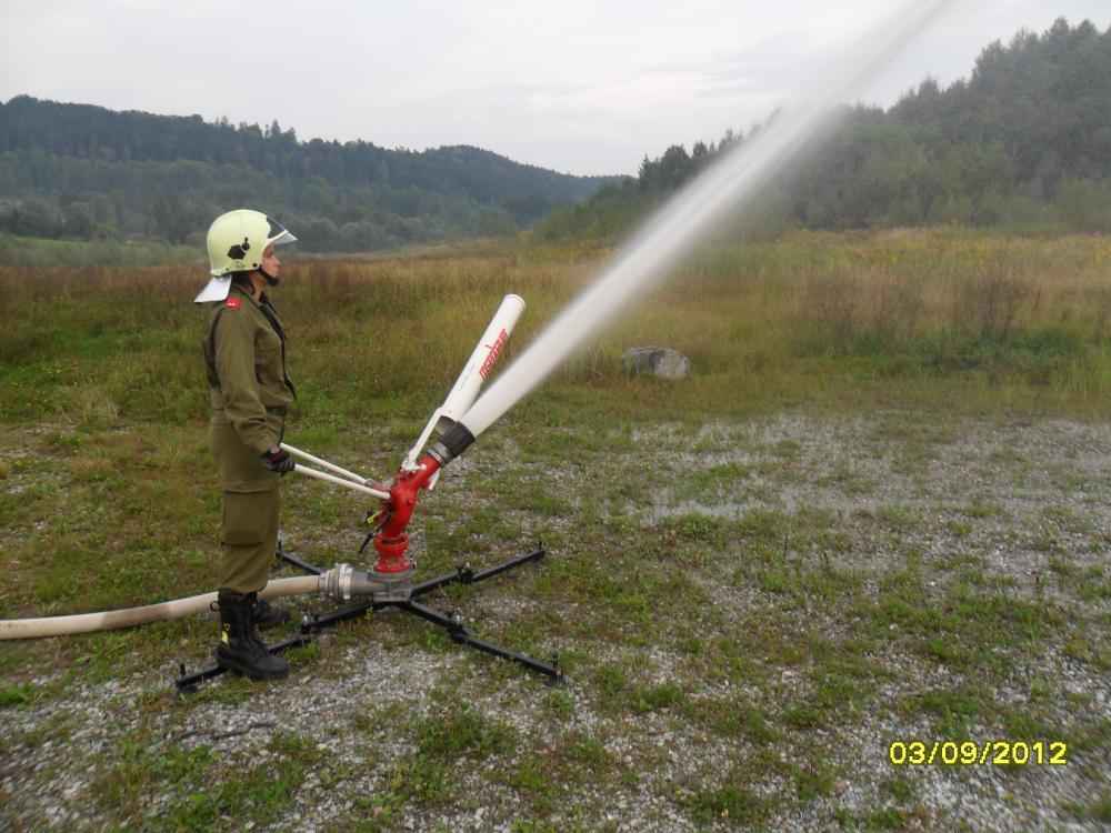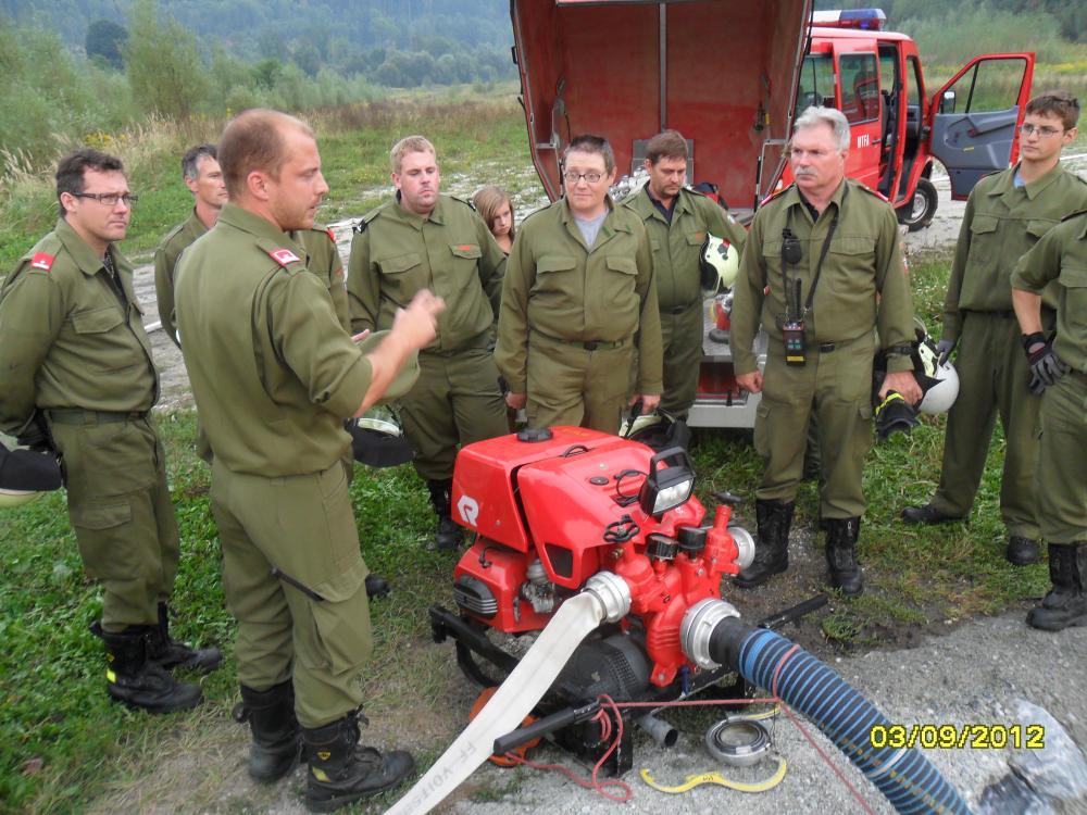 VOITSBERG, am 03.09.2012 Im ehemaligen Bergbaugelände Zangtal wurde eine Ausbildungsübung zum Thema „Waldbrandbekämpfung“ durchgeführt. BM Bernd Unger erklärte den optimalen Einsatz einer Tragkraftspritze. Die taktisch richtige Verwendung von C-Rohr, B-Rohr und Wasserwerfer bei der Waldbrandbekämpfung in Hinblick auf die Aufbringung von Löschwasser und die Deckungsbreite der Strahlrohre wurde ebenfalls erklärt. Im praktischen Teil wurde die Kombination Tragkraftspritze mit Wasserwerfer auf Lafette beübt.
