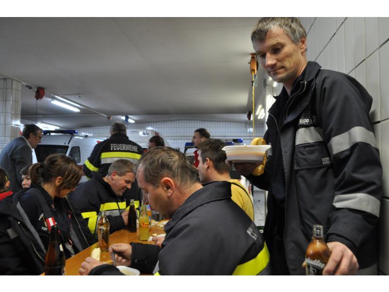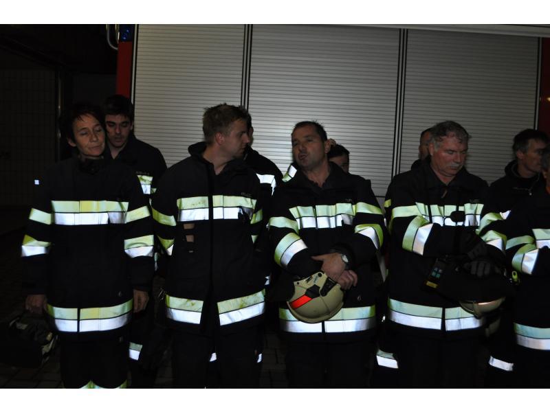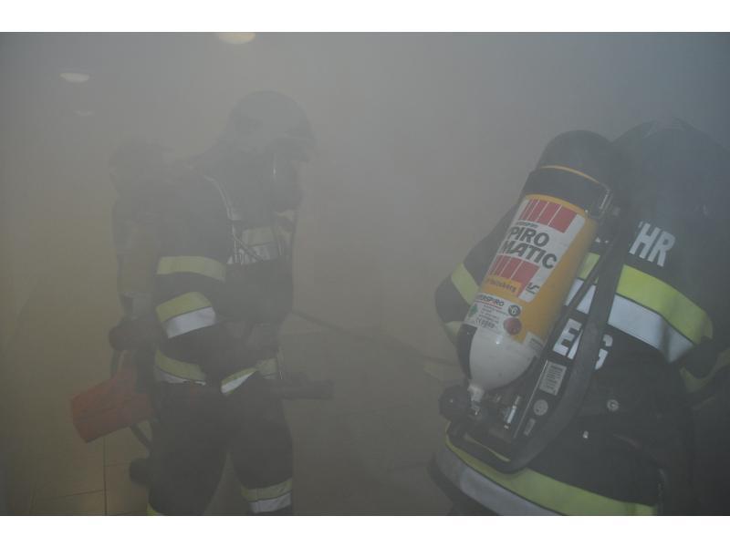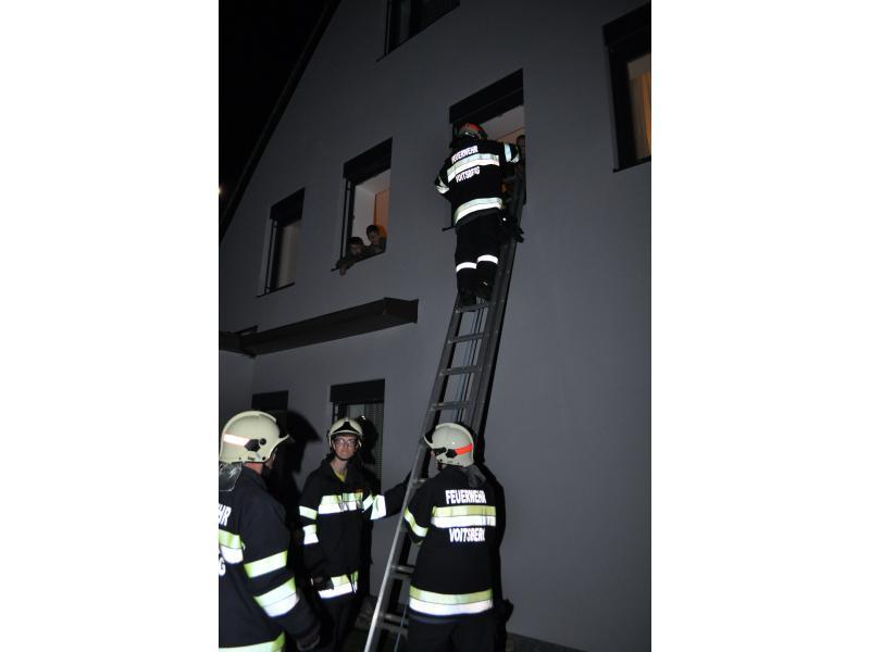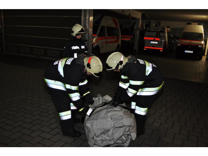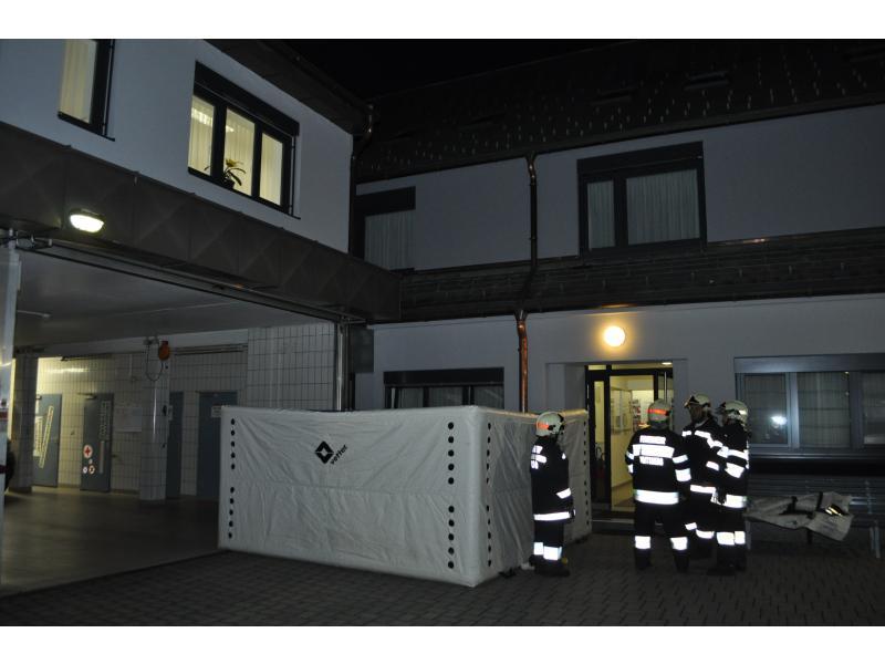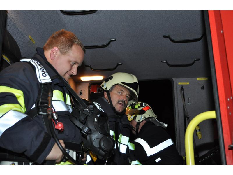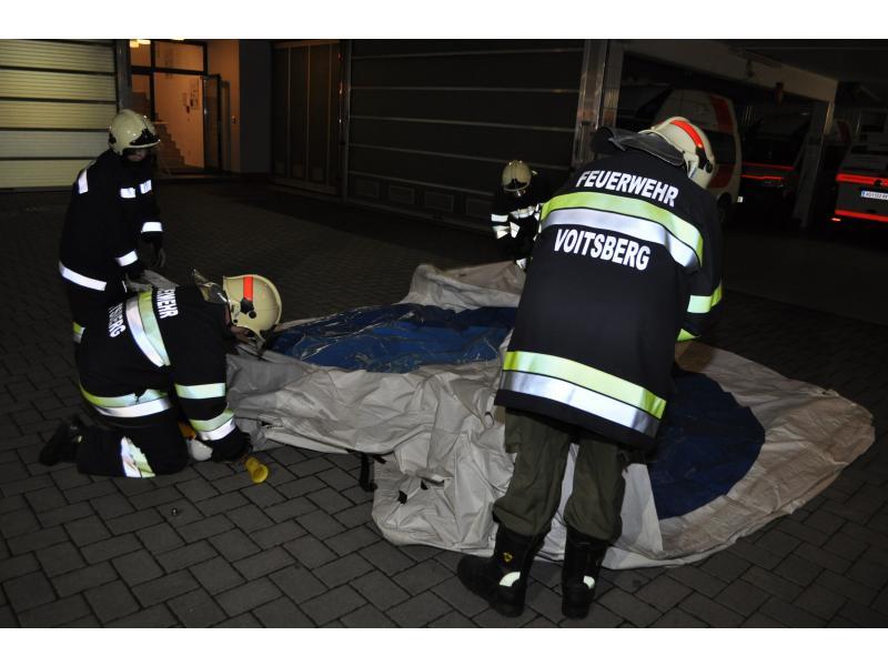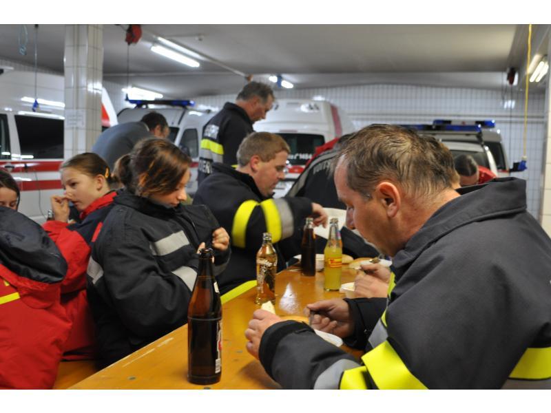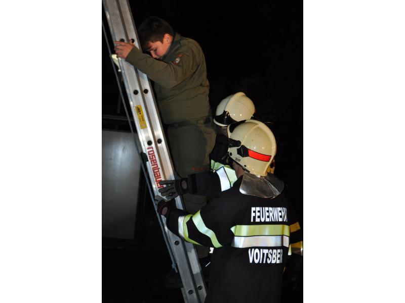 VOITSBERG, am 14.10.2013 Diesmal wurde die Einsatzzentrale des Roten Kreuzes Voitsberg beübt. Übungsannahme war ein Kellerbrand, bei welchem der Westteil des Objektes betroffen war. Die Brandmeldeanlage meldete an Florian Steiermark den Brand mit der Zusatzmeldung das sich noch 6 Personen im Haus befinden. Die alarmierte FF Voitsberg begann sofort nach Erkundung des Einsatzleiters BI d. F. Ing. Bernd Unger mit dem Brandangriff unter schwerem Atemschutz im Keller, wobei eine Person mit einer Rauchgasvergiftung geborgen und dem Roten Kreuz übergeben wurde. Eine weitere Person wurde mit Hilfe des Sprungretters vom Dach gerettet. Vier vom Brand überraschte Rotkreuzhelfer waren in den Schlafräumen im 1. Stock eingeschlossen und konnten diese nur über einen hergestellten Leiterweg verlassen. Gleichzeitig wurden die in den Garagen geparkten Einsatzfahrzeuge von den diensthabenden Rotkreuzmitarbeitern in Sicherheit gebracht um die Einsatzbereitschaft zu gewährleisten. Bei der abschließenden Schlussbesprechung meldete der Einsatzleiter dem Wehrkommandanten HBI Ing. Klaus Gehr die erfolgreiche Beendigung der Übung. Dieser bedankte sich für die Bereitstellung des Objektes und die Vorbereitung durch OBI Michael Münzer und LM d. S. Christoph Amberger. Der „Chef“ des Roten Kreuzes Voitsberg und der FF Voitsberg Bürgermeister Ernst Meixner lobte die gute Zusammenarbeit und zeigte sich sehr stolz über den Übungsverlauf. Der Brandschutzbeauftragte Franz Sommer erläuterte den Ablauf und lud namens des ÖRK alle Übungsteilnehmer zu einer gemeinsamen Gulaschsuppe mit Getränken ein.