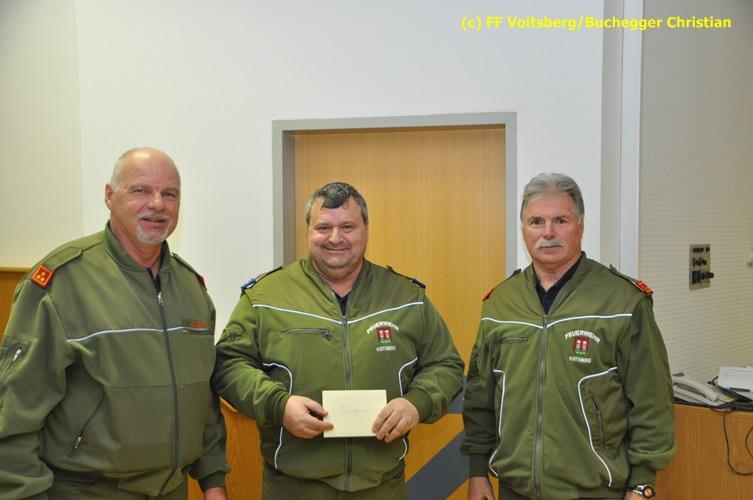 VOITSBERG, am 24.11.2015 Im Anschluss an die Stabilisierungspaket-Schulung gratulierten der Wehrkommandant HBI Ing. Klaus Gehr und HBM Karlheinz Buchegger dem Öffentlichkeitsbeauftragten HBMdV Walter Ninaus zur Vollendung seines 60. Lebensjahres namens aller FeuerwehrkamerdInnen und übergaben ihm ein Geschenk.