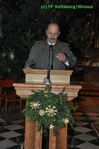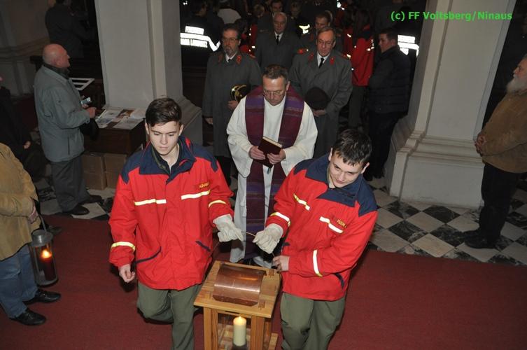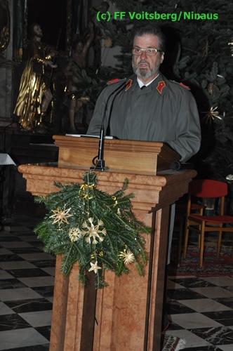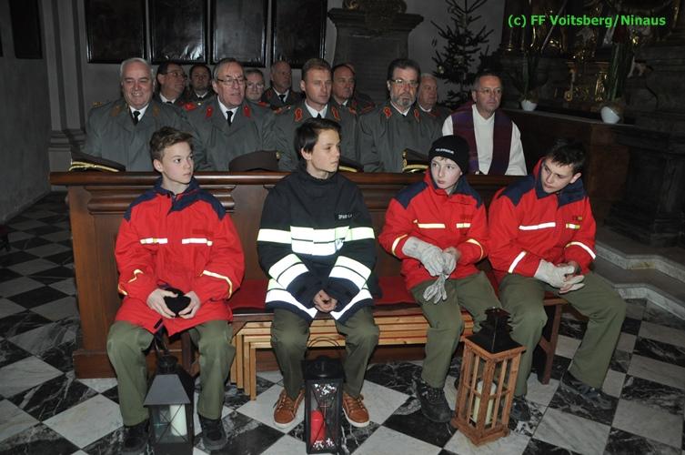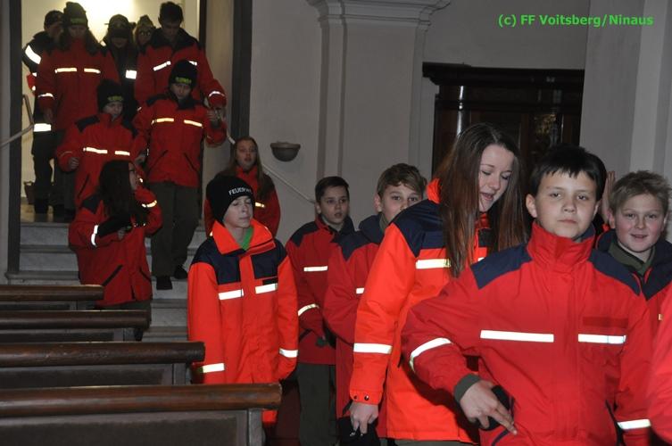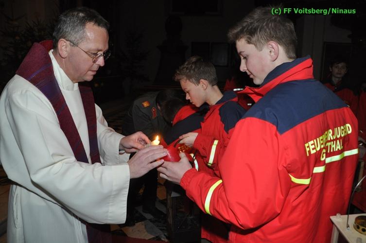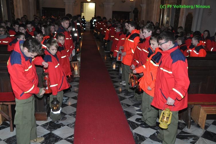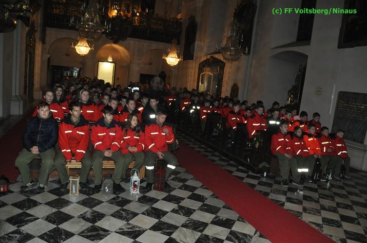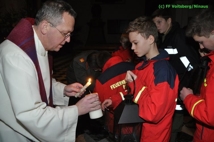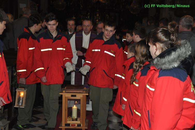 VOITSBERG, am 23.12.2015 Das Friedenslicht aus Bethlehem wurde heuer für den Bereich Voitsberg in der Josefskirche in Voitsberg von Dechant und Stadtpfarrer Mag. Gerald Krempl gesegnet und mit Unterstützung von LFR Engelbert Huber an die Feuerwehrjugend ausgegeben. Über 200 Teilnehmer an diesem besinnlichen Zusammentreffen zeigen die gute Jugendarbeit im Bereich auf und lassen uns beruhigt in die Zukunft sehen, was den Nachwuchs in den Feuerwehren betrifft. Organisiert wurde diese Veranstaltung von der FF Voitsberg mit den Jugendbeauftragten Rene Sorger und Peter Kremaucz in Zusammenarbeit mit dem Bereichsbeauftragten Harald Sorger. Nach Grußworten des Voitsberger Bürgermeisters Ernst Meixner, LFR Engelbert Huber und OBI Harald Sorger im Klosterhof stärkten sich die Teilnehmer in den Pfarrräumlichkeiten mit heißen Getränken und Mehlspeise und fuhren anschließend in ihre Standorte mit dem Friedenslicht zurück, um es an die Bevölkerung weiter zu geben.