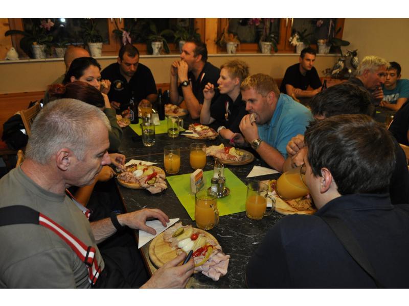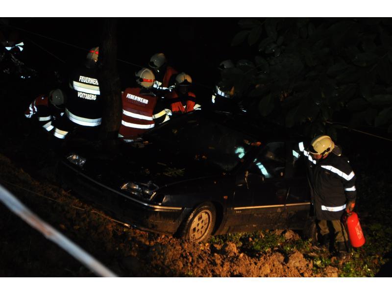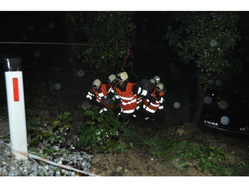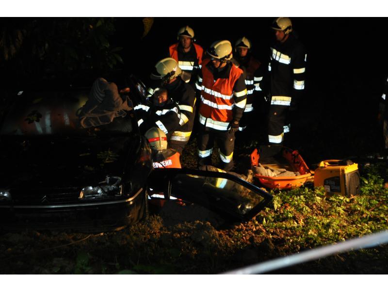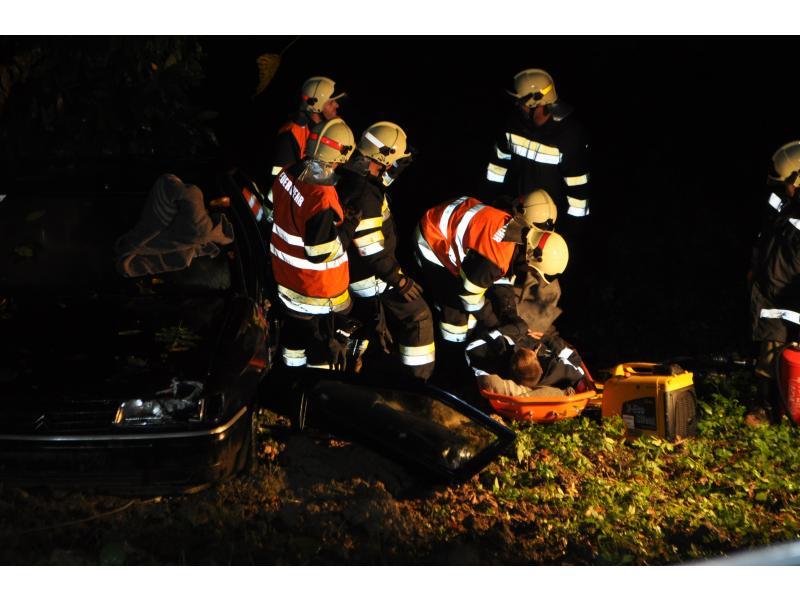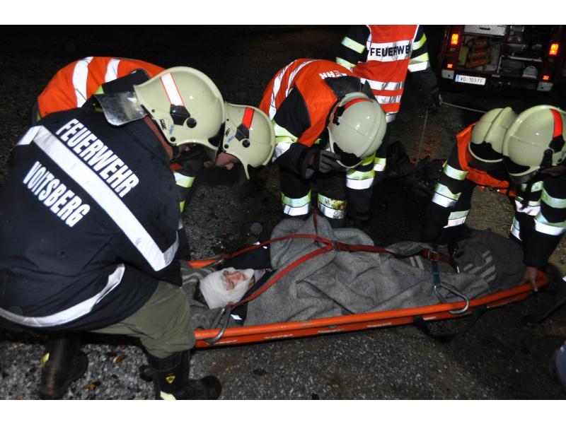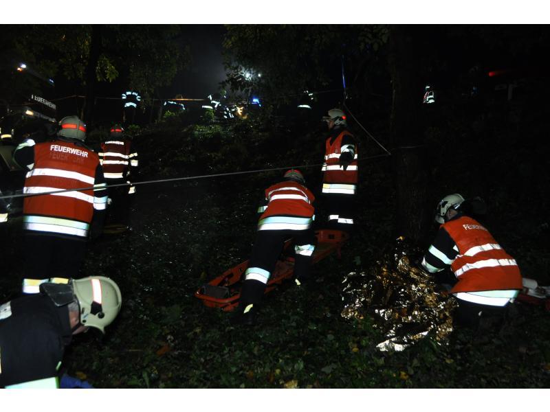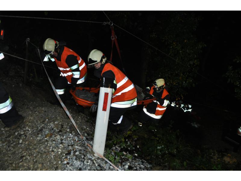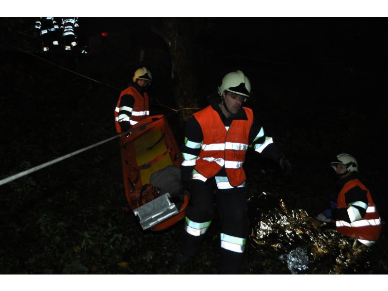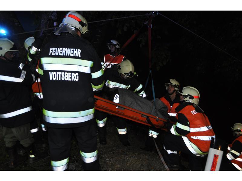 VOITSBERG, am 30.09.2013 Übungsannahme war ein Verkehrsunfall mit einem über eine 10 m hohe Böschung gestürzten PKW. Zwei Personen wurden aus dem Fahrzeug geschleudert und weitere zwei Personen waren im PKW eingeklemmt, wobei eine Person bewußtlos war. Nach der Erkundung durch den Einsatzleiter Christian Rozic begann man mit dem Aufbau eines zweifachen Brandschutzes, mit der Versorgung der Verletzten durch die Feuerwehrsanitäter, mit dem Bergen der Eingeklemmten unter Verwendung eines Spreitzers sowie mit dem Aufseilen mittels Korbtrage und Übergabe an den Rettungsdienst. Die Übungsvorbereitung lag in den Händen von HBM Karlheinz Buchegger und LM Alexander Kröpfl. Nach der abschließenden Übungsnachbesprechung bedankte sich HBM Buchegger beim Besitzerehepaar Ofner für die Bereitstellung ihres Grundstückes und für die Einladung zu einer abschließenden Jause mit Getränken namens der FF Voitsberg mit einem Blumenstrauß.