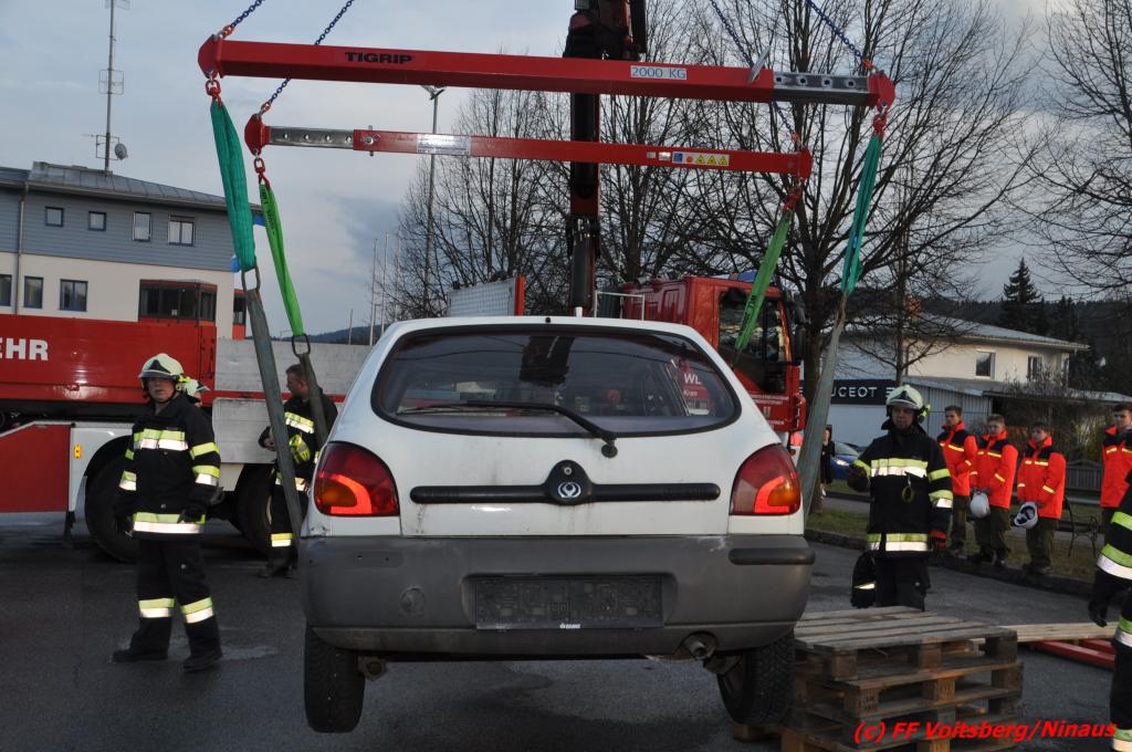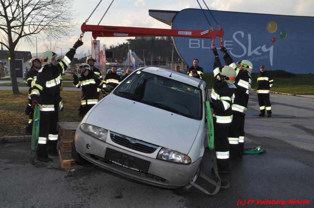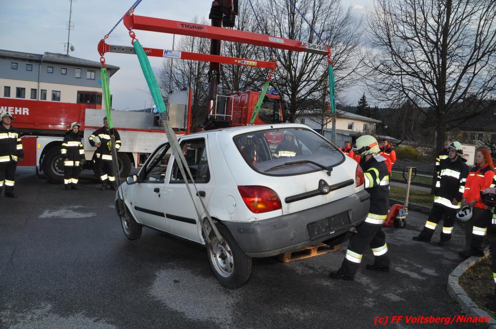 VOITSBERG, am 29.03.2016 Im ersten Teil der Übung zeigte OBI Michael Münzer unter Verwendung des WLF-Kran die Handhabung der neu angeschafften Spreiztraversen bei der Bergung eines PKW. Hier geht es in erster Linie darum, die KameradInnen während der Bergungsarbeiten von Unfällen zu schützen und als zweites die zu bergenden Fahrzeuge ohne weitere Schäden von der Unfallstelle zu entfernen.