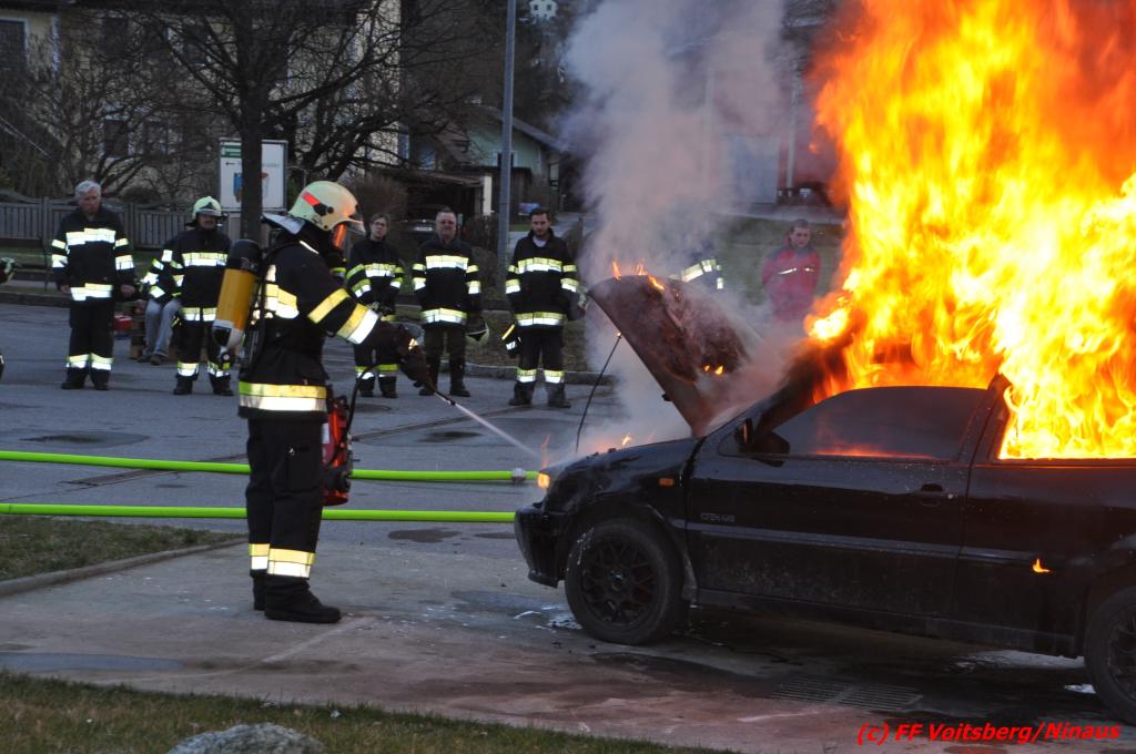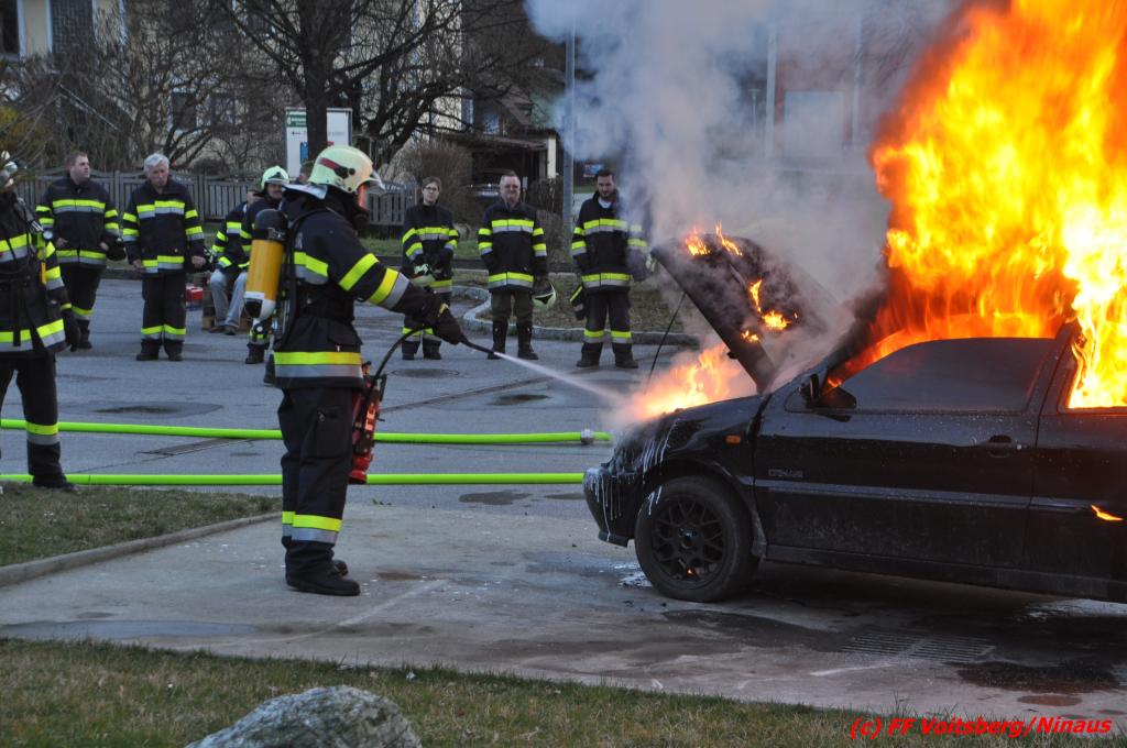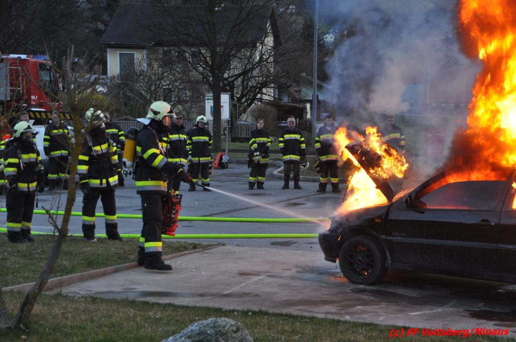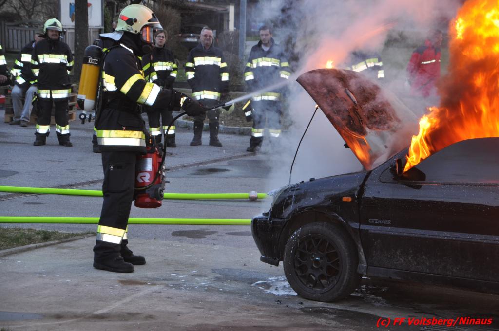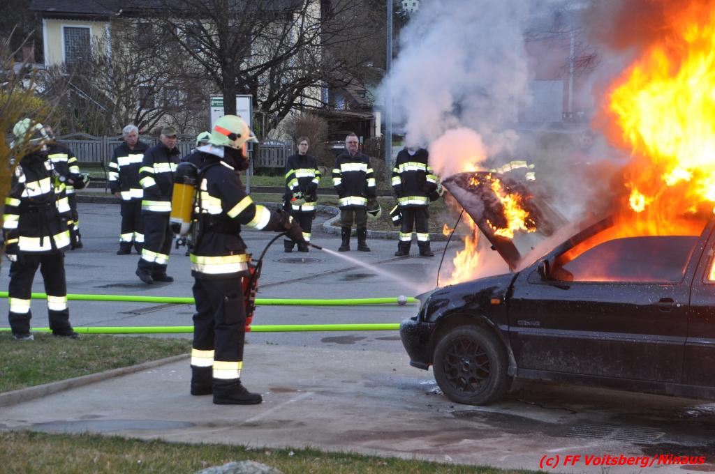 Der zweite Teil umfasste das Thema Autobrand. Bei einem solchen Brand kommt es zur Klassifizierung von vier Brandklassen (A,B,C und D). Speziell krebserregende Kunststoffe bei den Fahrzeugen führen immer mehr zu Problemen bei der Brandbekämpfung. Deswegen ist bei einem in Brand stehenden Fahrzeug ausschließlich der Brandangriff unter schwerem Atemschutz durchzuführen, erklärte Wehrkommandant HBI Ing. Klaus Gehr bei seinem Vortrag. Praktisch wurde mit einem neuen Löschgerät (tragbarer Feuerlöscher "Poly Portex SL 10") dessen effiziente und schnelle Wirkung bei solchen Einsätzen gezeigt. Mit dem HLF 3 Tunnel wurde letztlich ein erfolgreicher Löschangriff mit Schaum beübt.