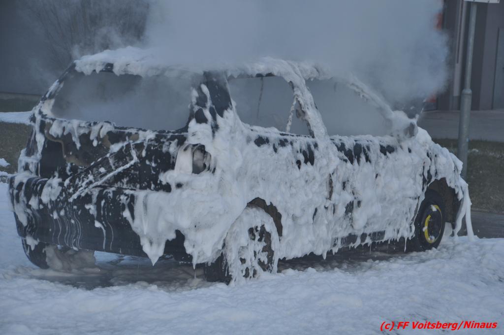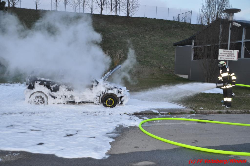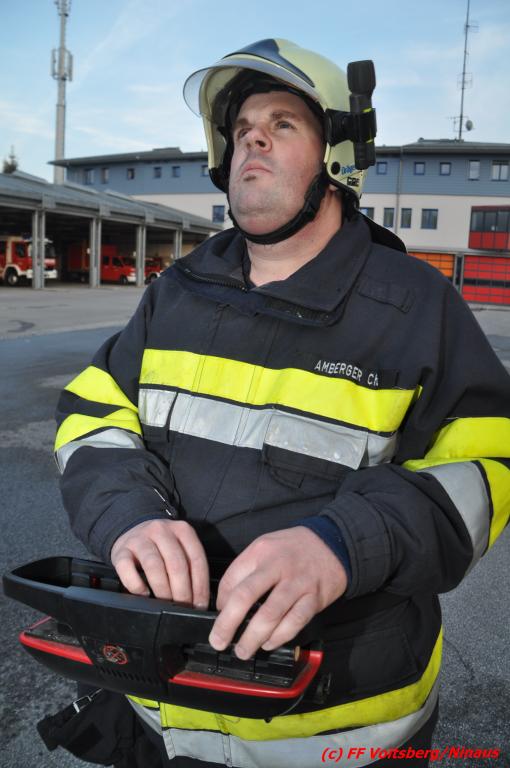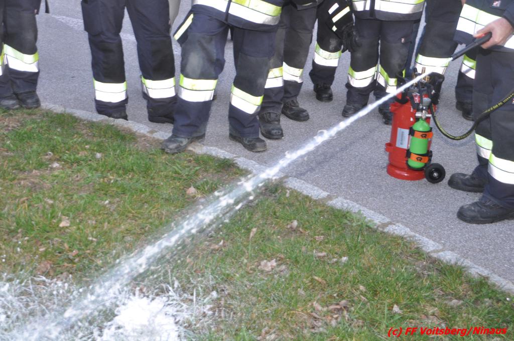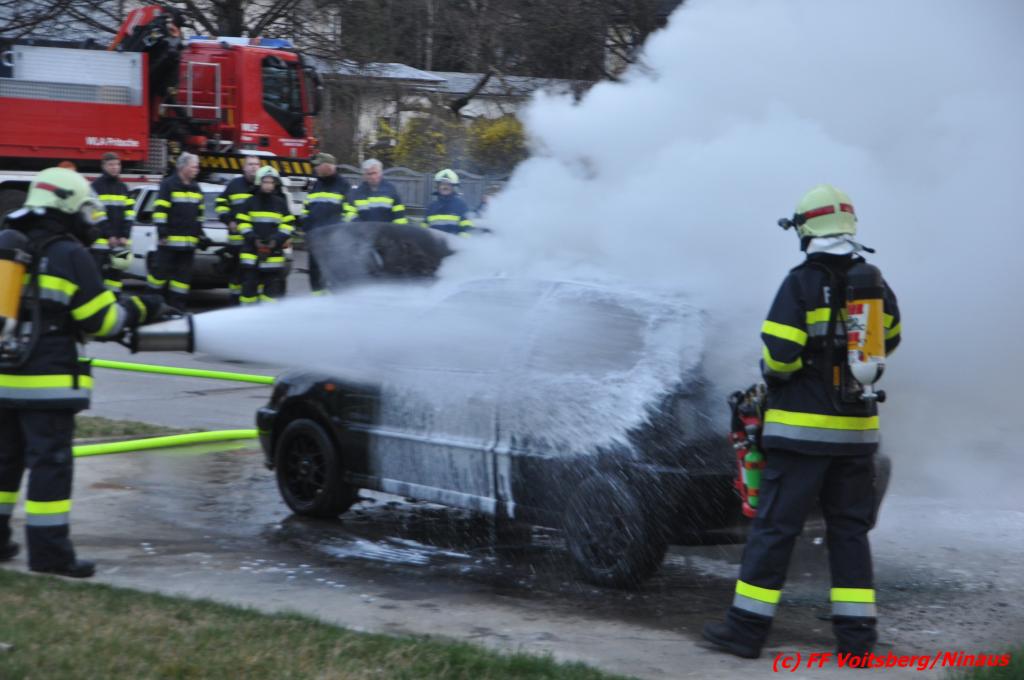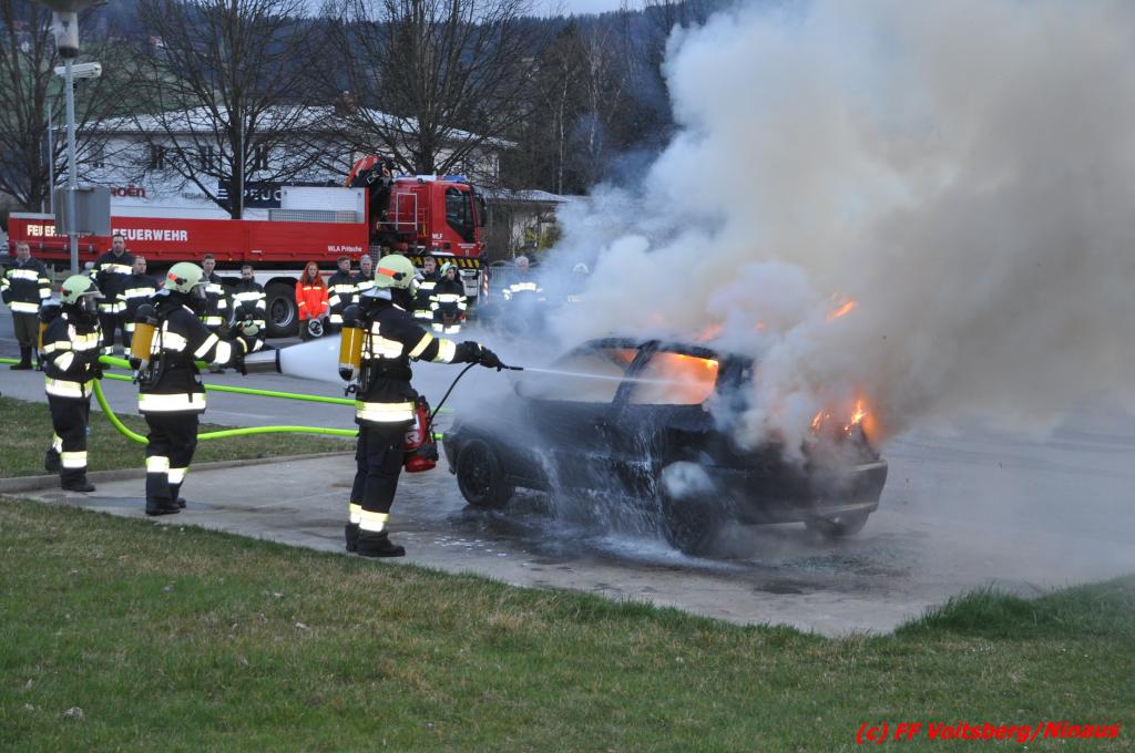 Der zweite Teil umfasste das Thema Autobrand. Bei einem solchen Brand kommt es zur Klassifizierung von vier Brandklassen (A,B,C und D). Speziell krebserregende Kunststoffe bei den Fahrzeugen führen immer mehr zu Problemen bei der Brandbekämpfung. Deswegen ist bei einem in Brand stehenden Fahrzeug ausschließlich der Brandangriff unter schwerem Atemschutz durchzuführen, erklärte Wehrkommandant HBI Ing. Klaus Gehr bei seinem Vortrag. Praktisch wurde mit einem neuen Löschgerät (tragbarer Feuerlöscher "Poly Portex SL 10") dessen effiziente und schnelle Wirkung bei solchen Einsätzen gezeigt. Mit dem HLF 3 Tunnel wurde letztlich ein erfolgreicher Löschangriff mit Schaum beübt.
