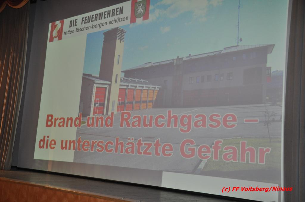 Wehrkommandant Ing. Klaus Gehr referierte über die Gefahren bei Bränden, im Besonderen den Gefahren durch Brand- und Rauchgase. Weiter strich er die Notwendigkeit an der Anbringung von Rauchgasmeldern in Wohnungen hervor, erläuterte unter Verwendung von Einsatzbildern die taktischen Vorgangsweisen bei Einsätzen und zeigte statistische Zahlen über die Einsatztätigkeiten auf. Die zahlreich erschienenen Besucher zeigten sich von den Vorträgen beeindruckt und stellten nach den Referaten Fragen an die Vortragenden. Schöne Preise wurden unter den Besuchern verlost.