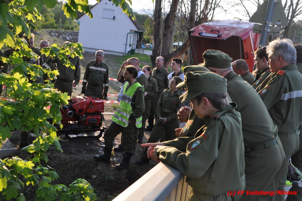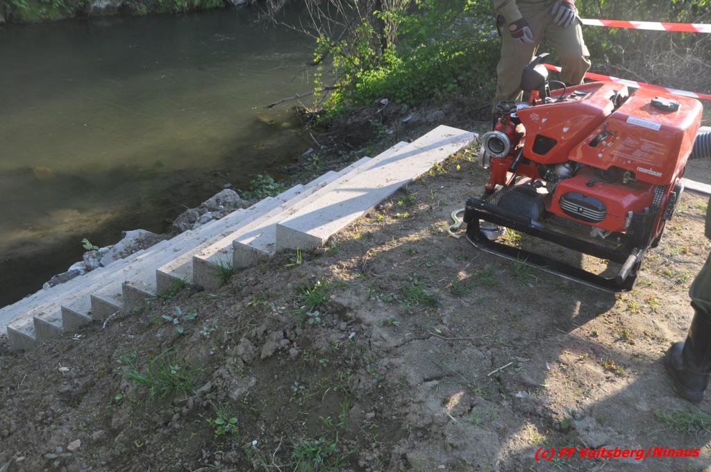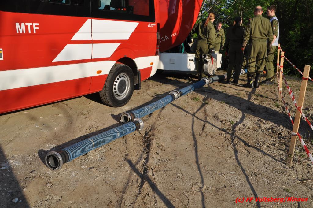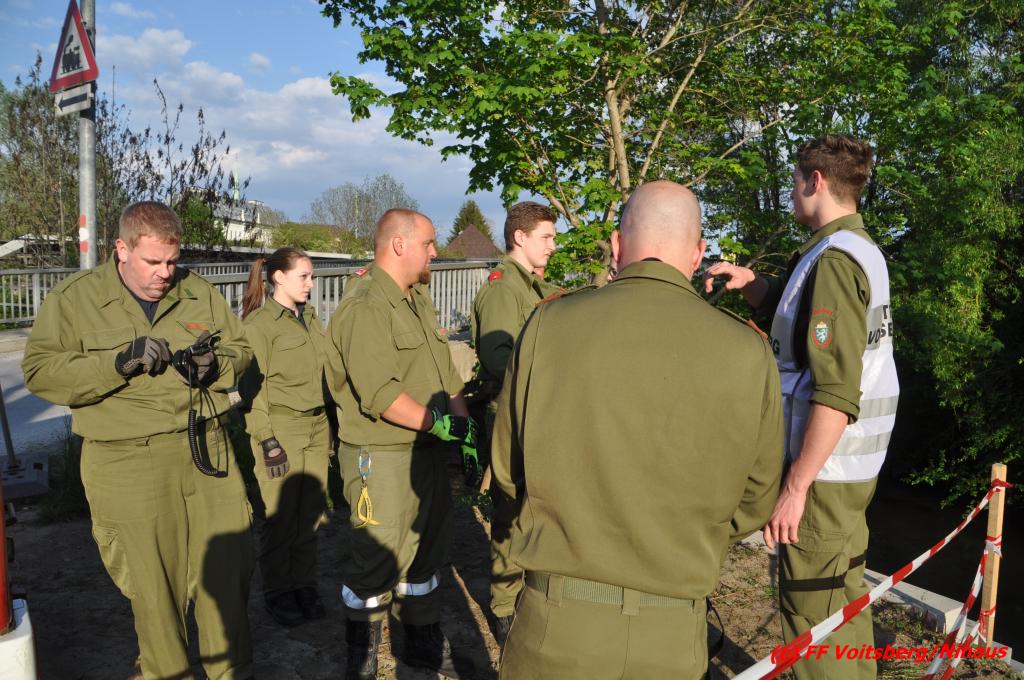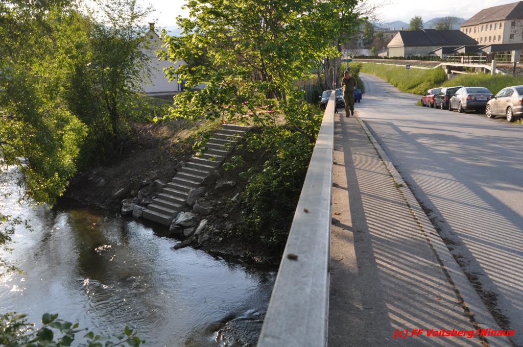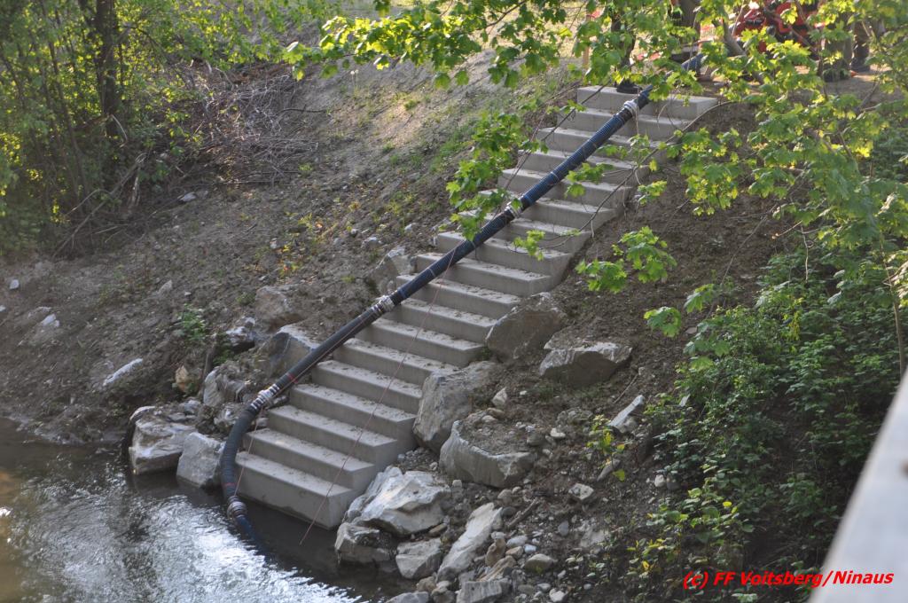 VOITSBERG, am 09.05.2016 Die Bevölkerung wird sich fragen, warum entlang der Kainach im Gemeindegebiet von Voitsberg insgesamt 11 Stiegen angebracht wurden. Die Erklärung besteht darin, dass diese im Zuge des Ausbaues des Hochwasserschutzes zum Verlegen der Saugschläuche von den Tragkraftspritzen bei Feuerwehreinsätzen angelegt wurden, um Wasser zur Brandbekämpfung aus der Kainach zu pumpen. Erstmals wurde eine Übung bei solch einer Saugstelle unter dem Schloss Greißenegg mit der Annahme eines Brandes beim alten Bauhof in der Rottenbachergasse. Das Aggregat wurde an oberster Stelle der Stiege abgestellt und insgesamt 6 Saugschläuche angelegt. Es wurde sodann eine 300 Meter lange Zubringleitung zum vermeintlichen Brandobjekt gelegt und mit dem aus der Kainach gepumpten Wasser das neue HLF 3 - Tunnel mit Wasser versorgt. Es wurde seitens des HBI Ing. Klaus Gehr und OBI Michael Münzer feuerwehrtaktisch der Brandangriff erläutert. Diese Saugstelle hat sich bestens bewährt. Nach der Nachbesprechung wurde vom Übungsleiter OLM d. F. Alexander Wallner, welchem zur erfolgreichen Absolvierung des Einsatzleiterlehrganges gratuliert wurde, das Übungsende befohlen.