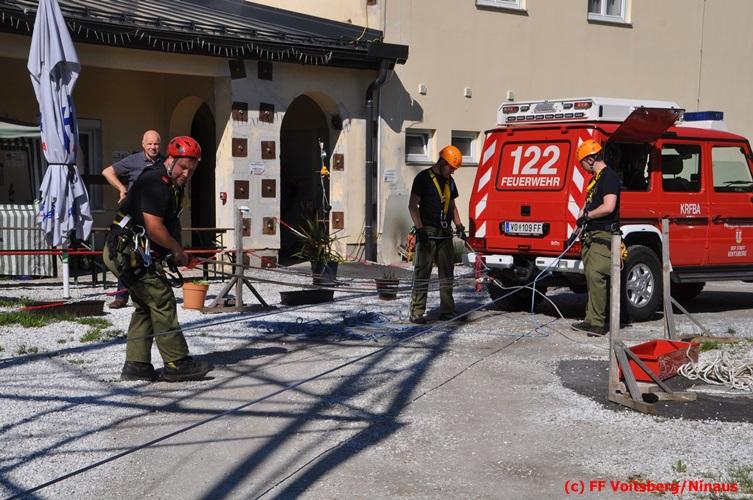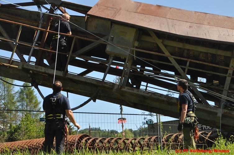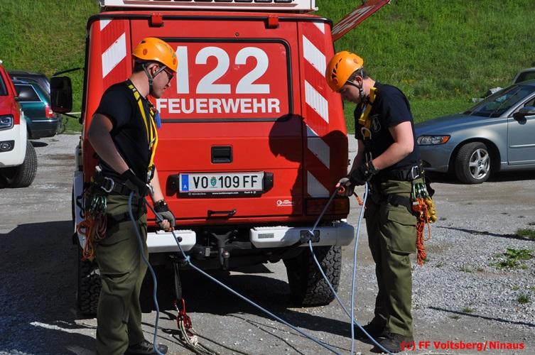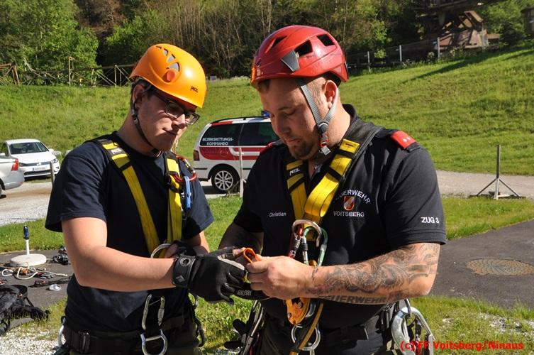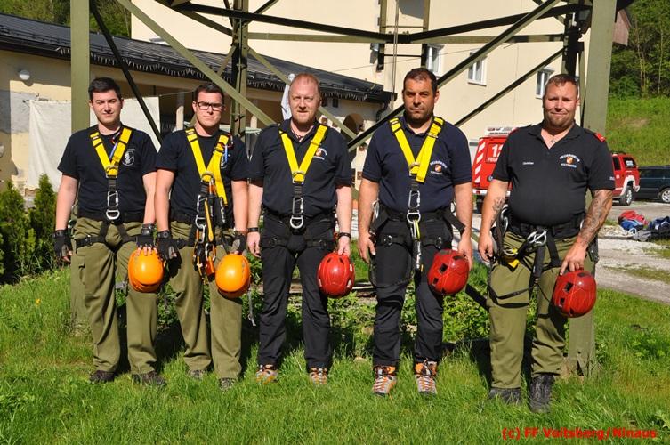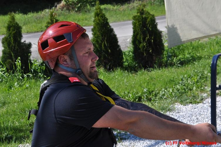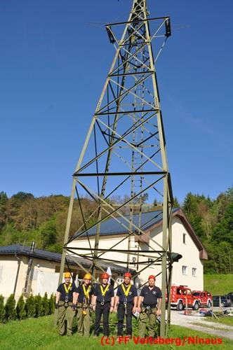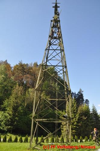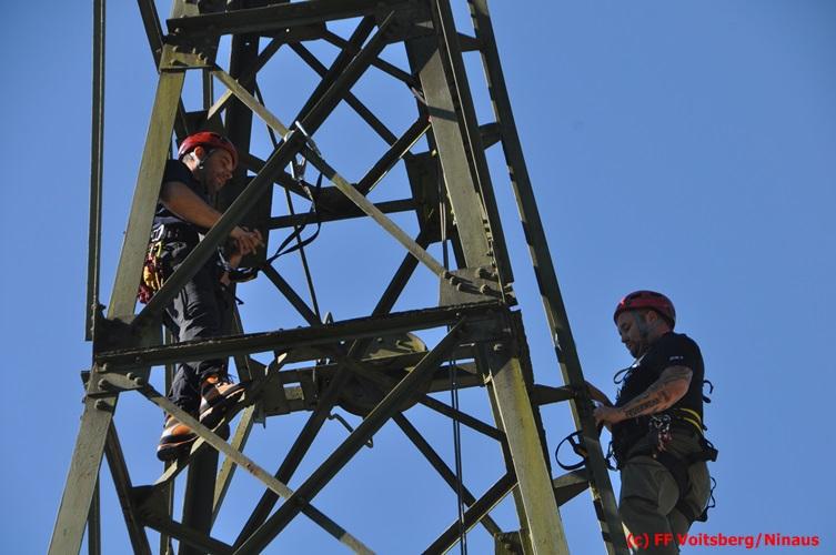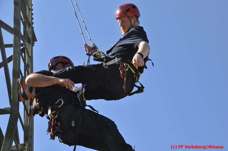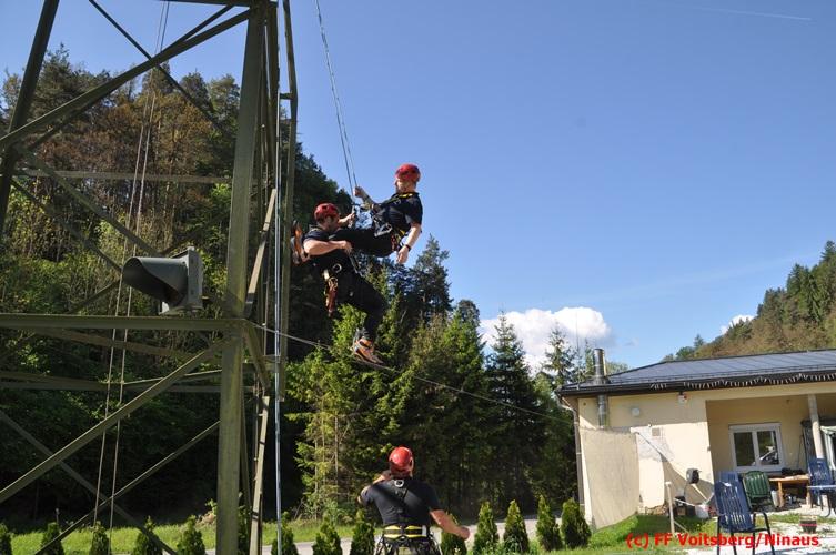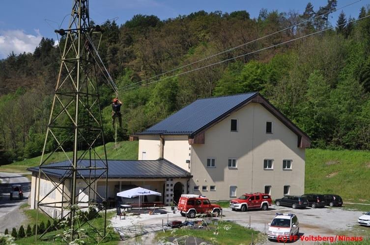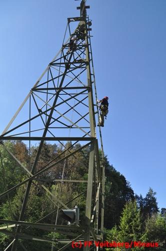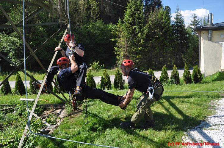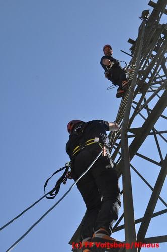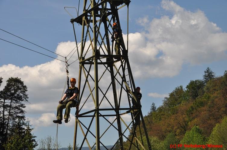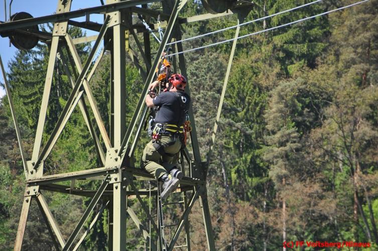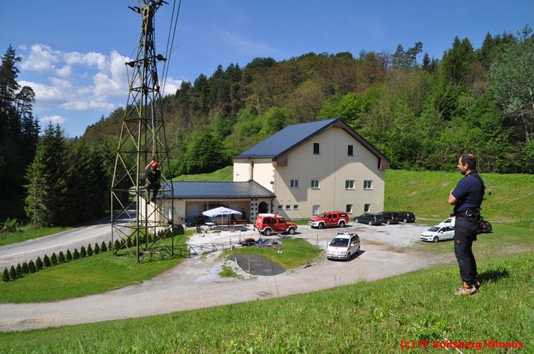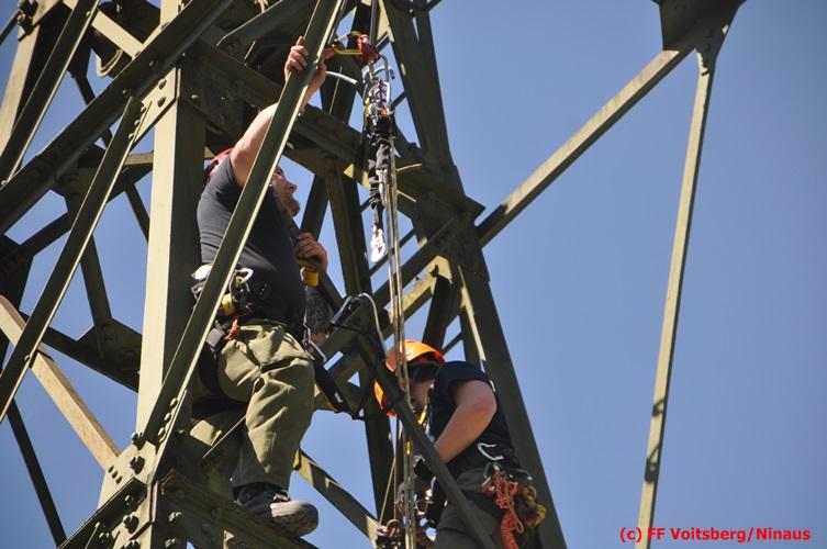 Erste Übungsannahme war die Rettung einer verletzten Person aus misslicher Lage vom einem 17m hohen Gittermasten, wobei der Retter mit Selbstsicherung sich zum Verletzten hocharbeitete. Um die Person retten zu können, mussten zwei Seile ca. 2 m über den Verunfallten angebracht werden, damit eine rasche und vor allem sichere Rettung gewährleistet war.