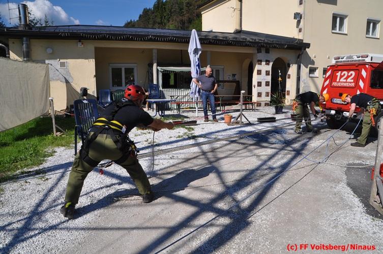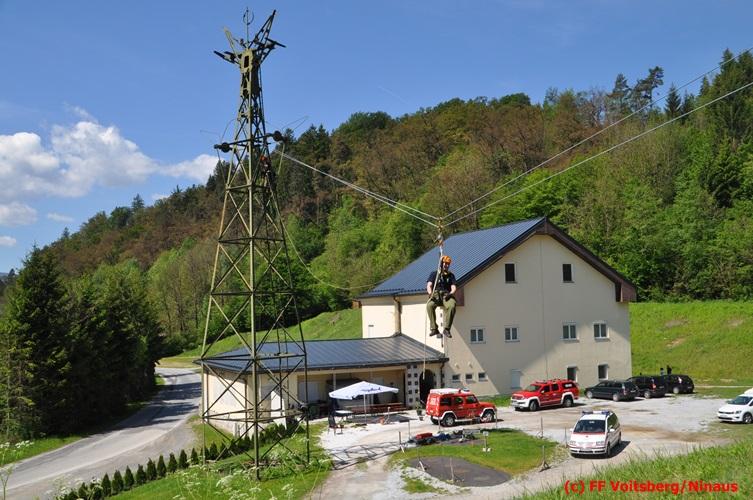 Das zweite Szenario war die Errichtung einer Seilbahn zum Überbrücken einer Schlucht, um Material und Mannschaft vom Ausgangspunkt zum Einsatzort zu bringen. Die Übung verlief ohne Zwischenfälle und diente der guten Zusammenarbeit zwischen den Feuerwehren Bärnbach und Voitsberg und der Festigung der MRAS-Einheit Nord.