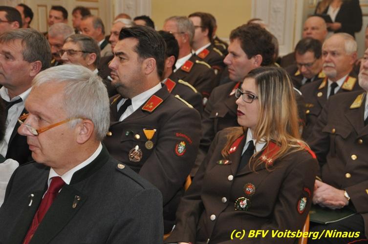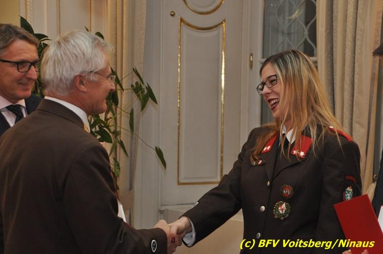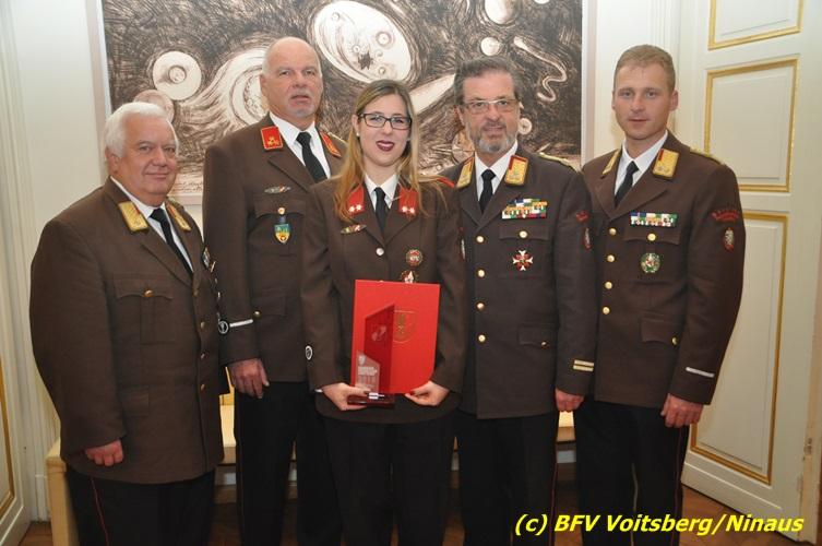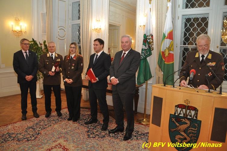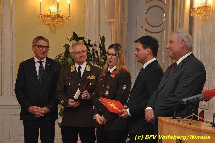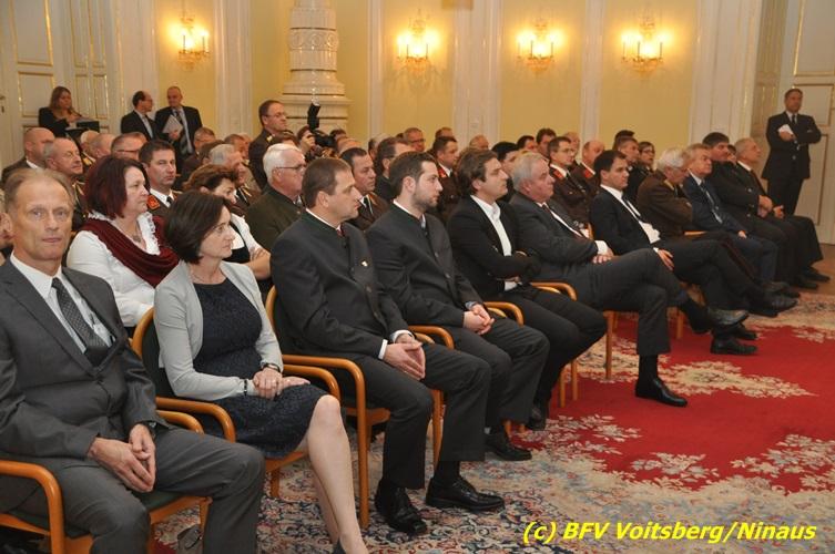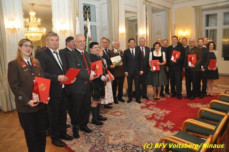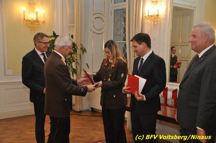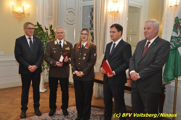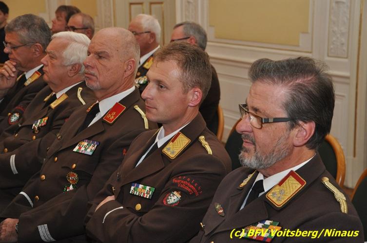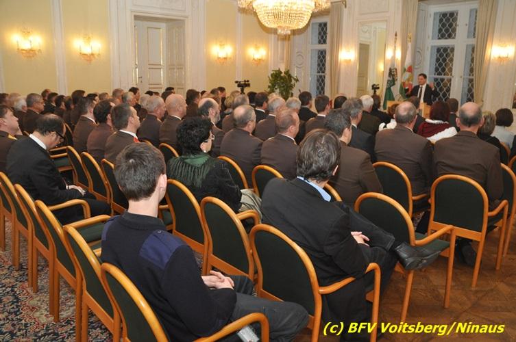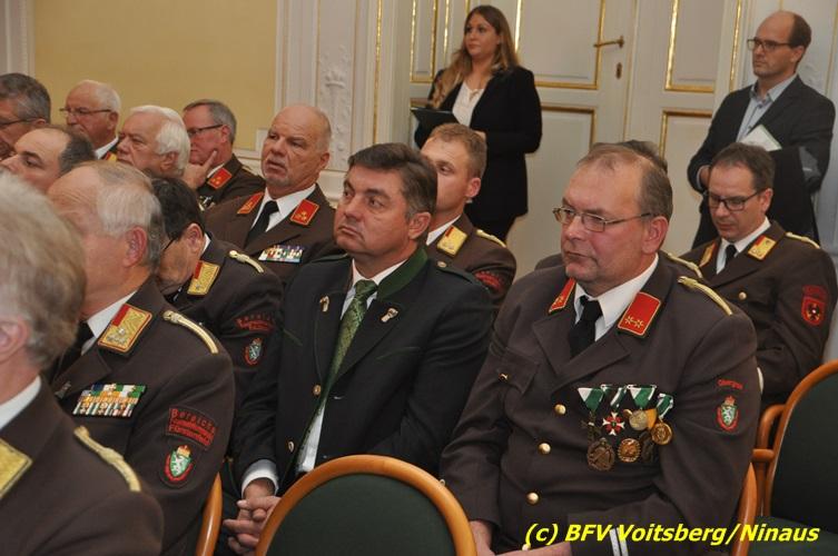 Der netten Feierstunde in der altehrwürdigen Grazer Burg wohnten HBI Ing. Klaus Gehr und HBM dV Walter Ninaus (für die FF Voitsberg), sowie BerFwKdt LFR Engelbert Huber, BR Christian Leitgeb und ABI Alfred Jauk bei.