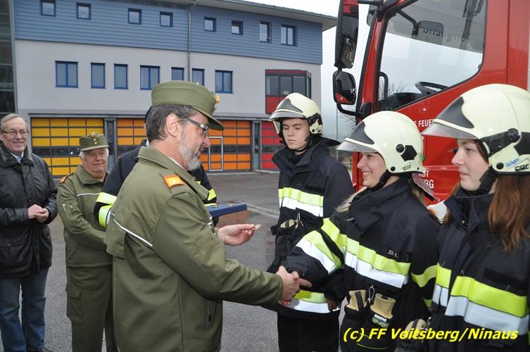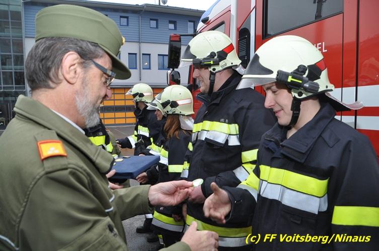 Weitere Ehrengäste waren Vizebürgermeister Kurt Christof, Stadtrat Markus Leinfellner, Franz Patz von den Amateurfunkern, ABI Alfred Jauk, ABI d. V. Günter Höller, OBI Michael Münzer, BI d. F. Alfons Tappauf, BI d. F. Ing. Bernd Unger, EABI Rudolf Gargitter und die zahlreich erschienenen Familien- und Feuerwehrmitglieder. Bei der abschließenden Verleihung der Bewerbsabzeichen zeigten sich die Bewerber erleichtert und erfreut und bedankten sich bei ihrem Ausbilder, OBM d. F. Rudolf Deutschmann mit einem Erinnerungsgeschenk. Weiter wurde Waltraud Veigl und Rene Sorger für ihre Bereitschaft als Ergänzungsteilnehmer (Aushilfen) mit einer kleinen Aufmerksamkeit gedankt.