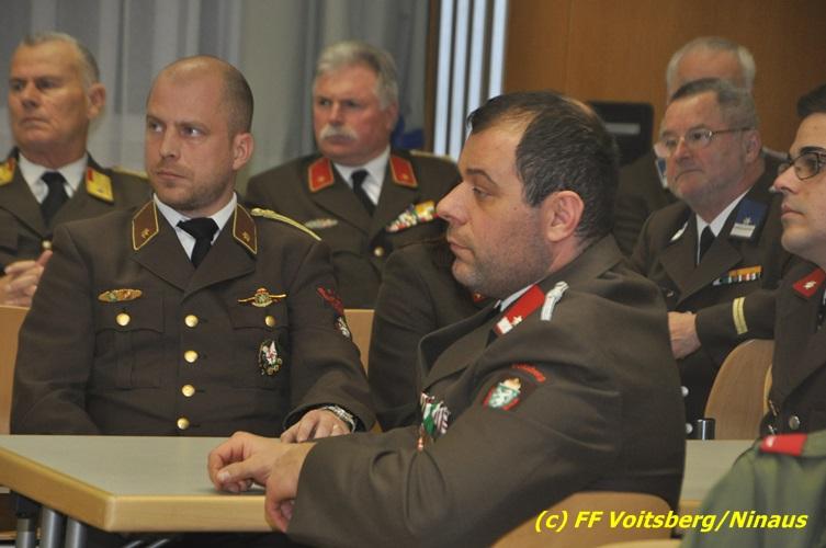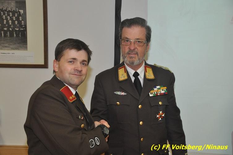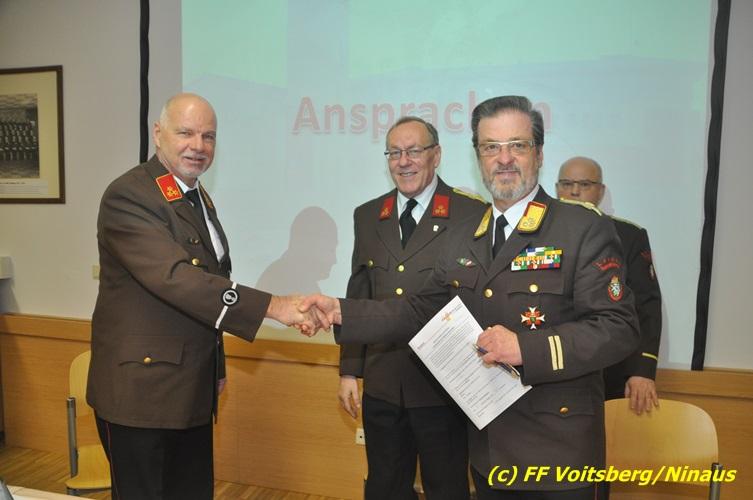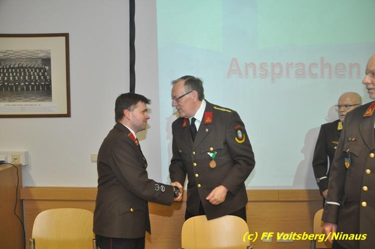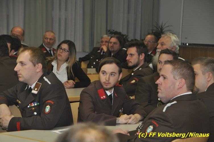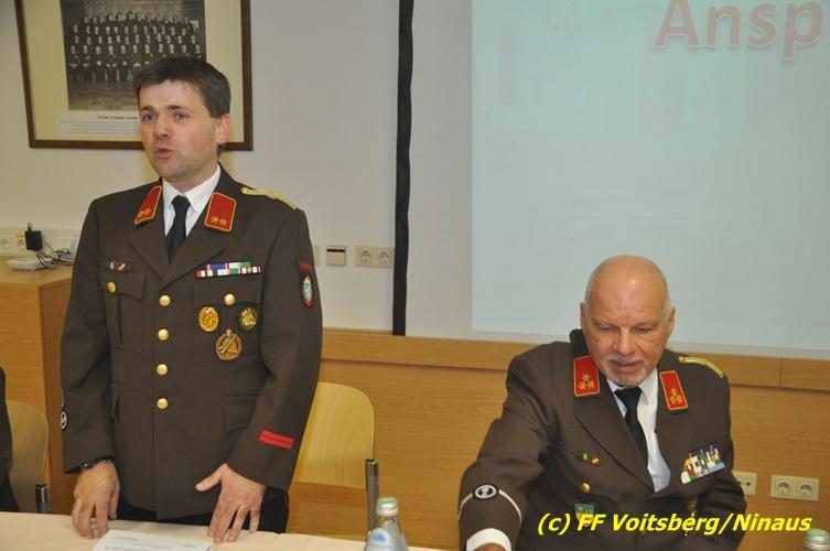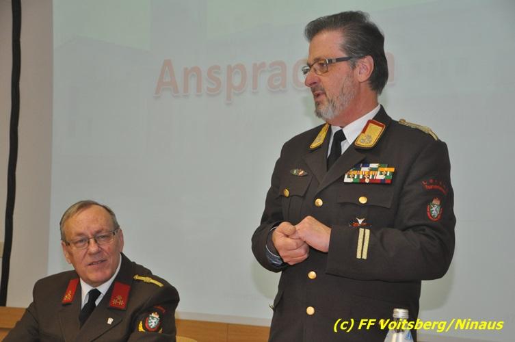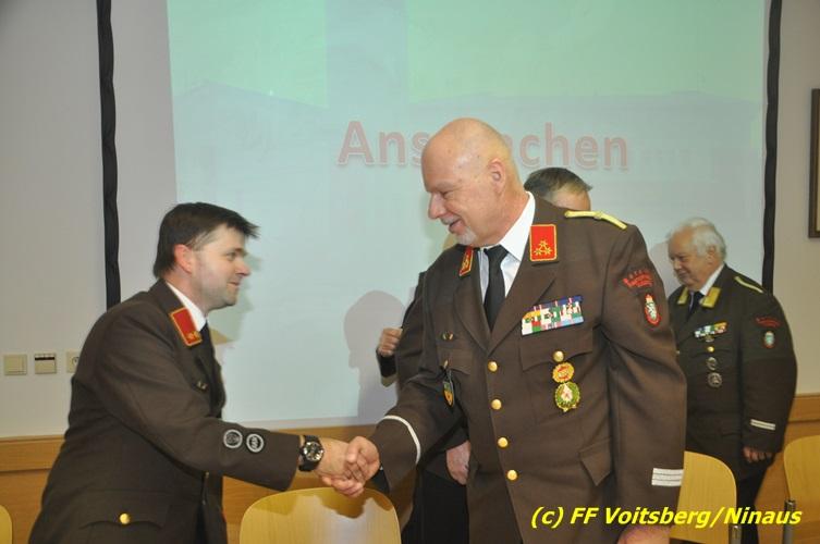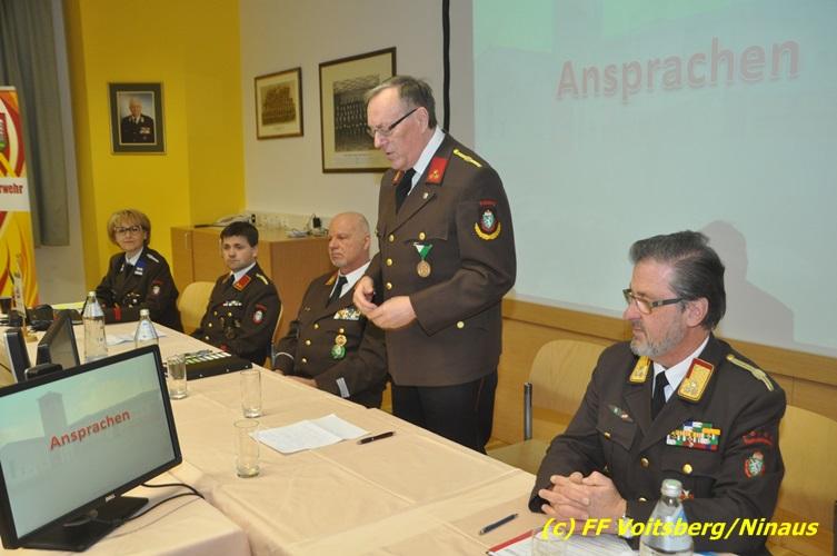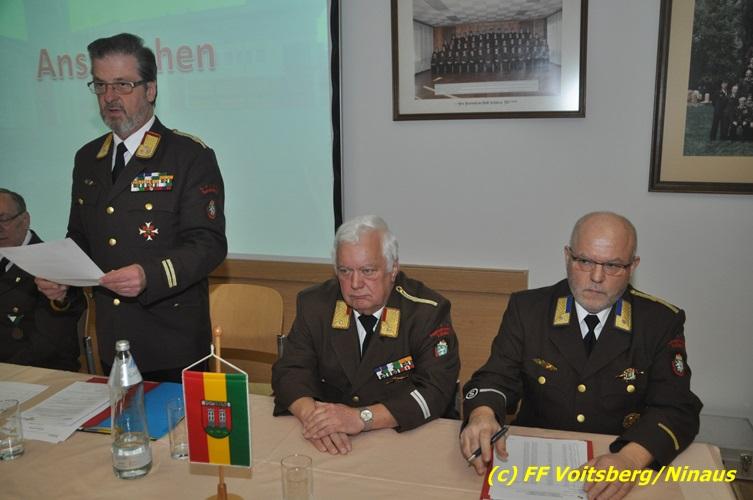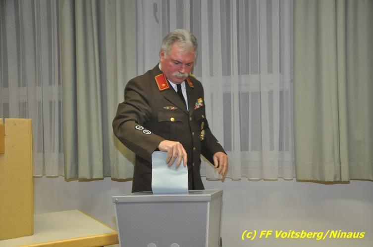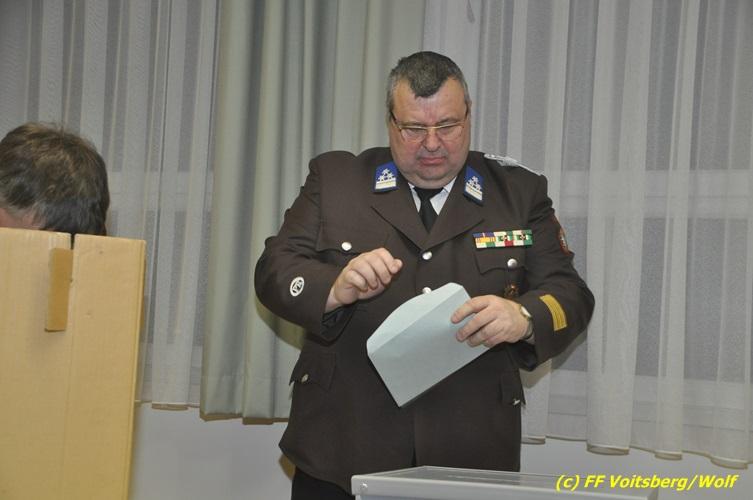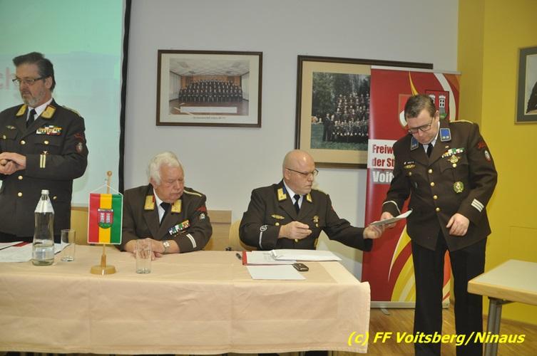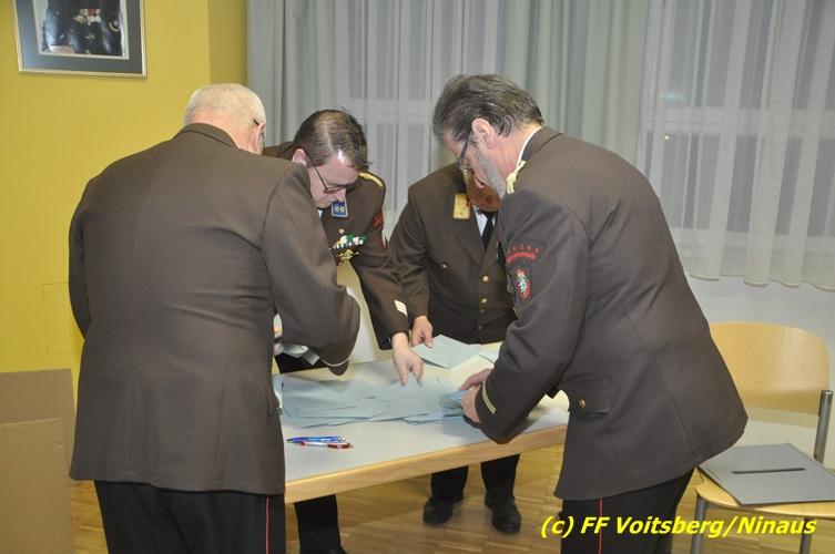 VOITSBERG, am 11.02.2017 Neuwahlen bei der FF Voitsberg - HBI Ing. Klaus Gehr und OBI Michael Münzer mit großer Mehrheit wiedergewählt Unter dem Vorsitz des Bereichsfeuerwehrkommandantern LFR Engelbert Huber standen die Neuwahlen des Kommandos der FF Voitsberg auf der Tagesordnung der Wahlversammlung. Zu Wahlhelfern wurden eingangs die Kameraden Alfred Jauk, Günter Höller und Hendrik Wolf ernannt. Zur Wahl zum Kommandanten wurde ein Wahlvorschlag, lautend auf Klaus Gehr, ordnungsgemäß eingebracht und geprüft. Nach geheimer Wahl wurde HBI Ing. Klaus Gehr fast einstimmig in seiner Funktion bestätigt. Zur Wahl des Kommandanten-Stellvertreters wurde auch ein Wahlvorschlag, lautend auf Michael Münzer, ebenfalls ordnungsgemäß eingebracht und geprüft. Auch hier wurde OBI Michael Münzer mit großer Mehrheit in seiner Funktion bestätigt. Beide nahmen die Wahl an. LFR Huber gratulierte beiden zum eindeutigen Wahlergebnis und lobte in seinen Grußworten die Leistungen der FF Voitsberg für des BFV Voitsberg. Auch die gute Zusammenarbeit mit der Stadtgemeinde Voitsberg unter Bürgermeister Ernst Meixner wurde gewürdigt. Die wiedergewählten Kommandanten dankten in ihren Ausführungen für das entgegengebrachte Vertrauen und versprachen dieses auch zum Wohle der FF Voitsberg einzubringen. Bürgermeister EHBI Ernst Meixner gratulierte ebenfalls dem neuen, alten Kommando und bot auch weiter die Zusammenarbeit an. Die Stadtgemeinde Voitsberg werde für die Anliegen der Stadtfeuerwehr Voitsberg stets ein offenes Ohr haben und die Wünsche nach Möglichkeit erfüllen. Dank sprach er auch dem BFK unter LFR Engelbert Huber für die gute Zusammenarbeit aus.