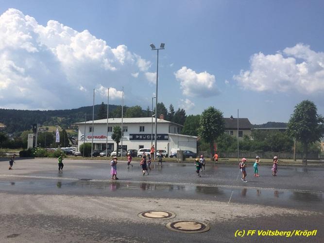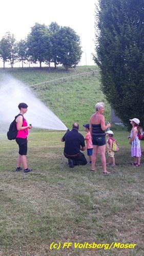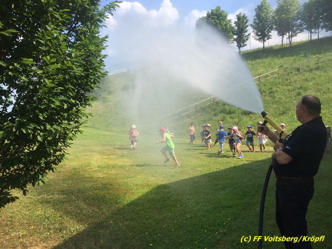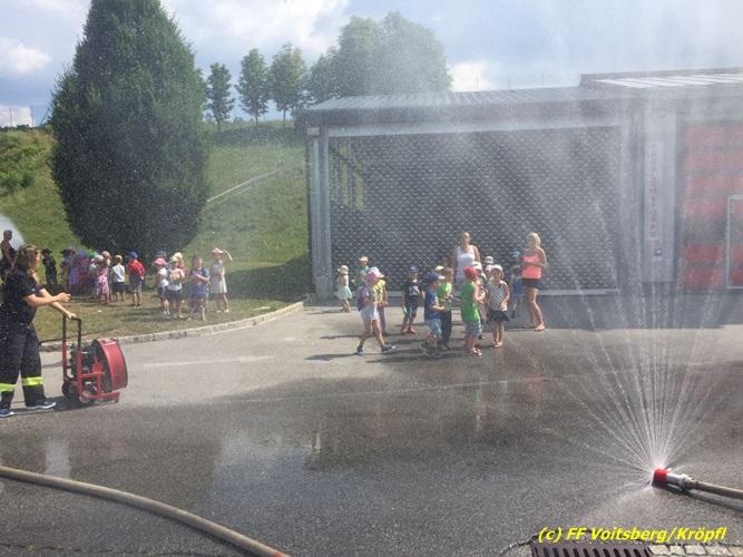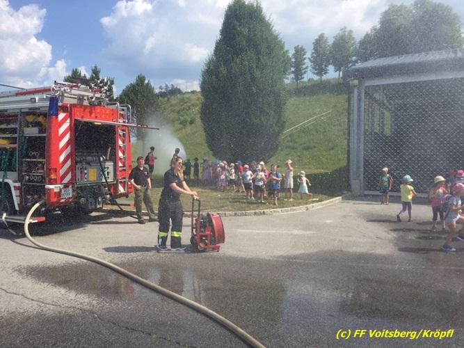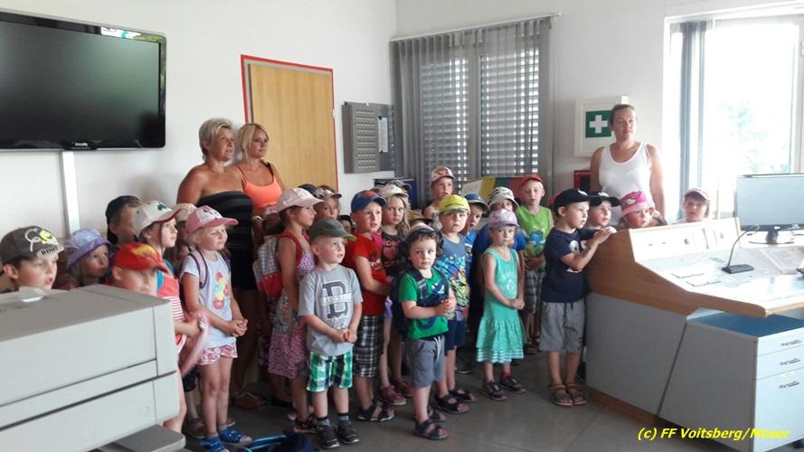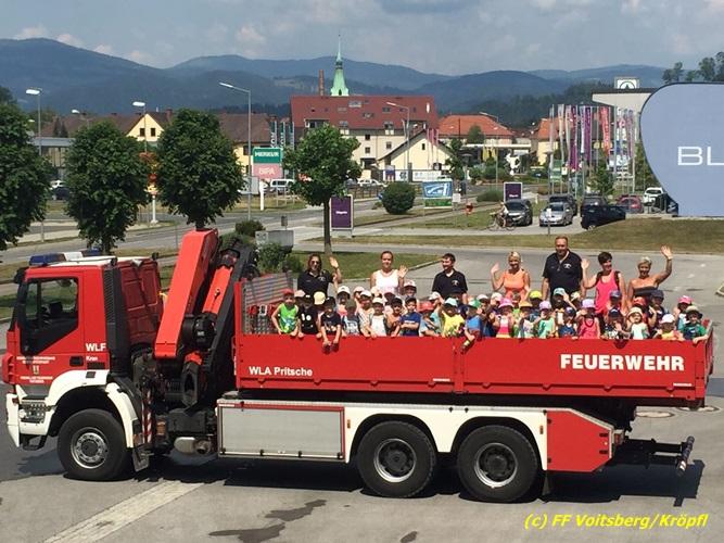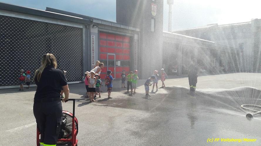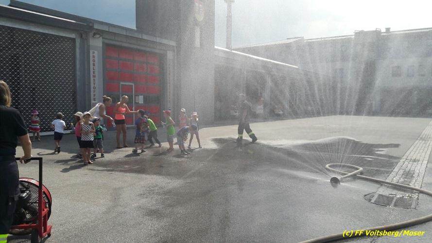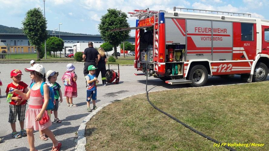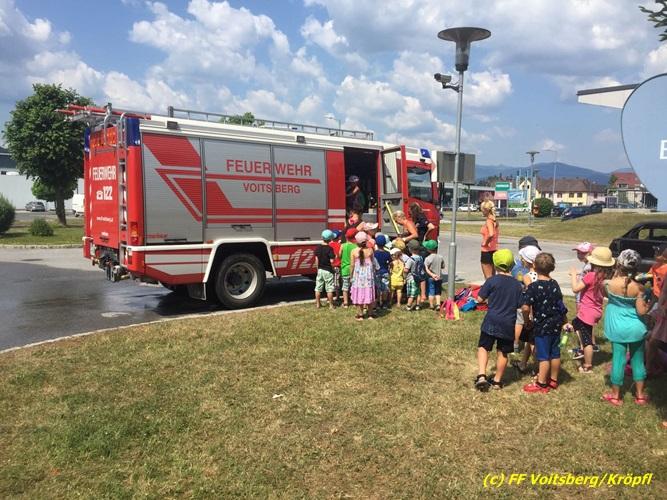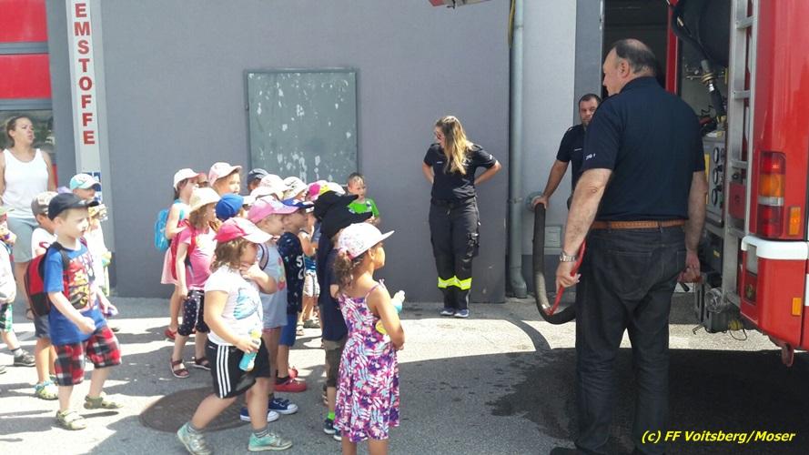 VOITSBERG, am 21.06.2017 Zahlreiche Kindergartenkinder mit ihren Begleitpersonen fanden sich am 21. Juni 2017 bei prachtvollem Sommerwetter im Rüsthaus der Stadtfeuerwehr Voitsberg ein, um ein wenig die Feuerwehr zu beschnuppern. Nach der Begrüßung durch den Zugskommandanten Alexander Kröpfl in der Bereichsfunkzentrale „Florian Voitsberg“ wurde diese den Interessierten vorgestellt. Dann ging es, nach einer flüssigen Stärkung mit einem Kracherl weiter, um die Fahrzeuge kennenzulernen, einmal in einem solchen Platz zu nehmen und das Folgetonhorn von innen zu hören. Vorführungen mit dem Strahlrohr, wobei die Kinder dieses bedienen durften, der nasse „Einsatz“ mit dem Wasservorhang und einige andere Vorstellungen von Einsatzgeräten machte den Kindern viel Spaß und werden ihnen in Erinnerung bleiben. Ein abschließendes Gruppenfoto auf der Ladefläche des WLF rundete diesen für die Kinder sicherlich unvergesslichen Tag ab.