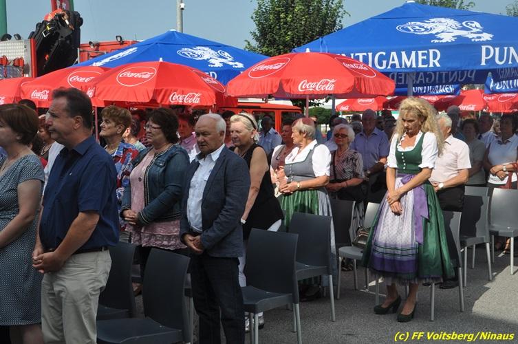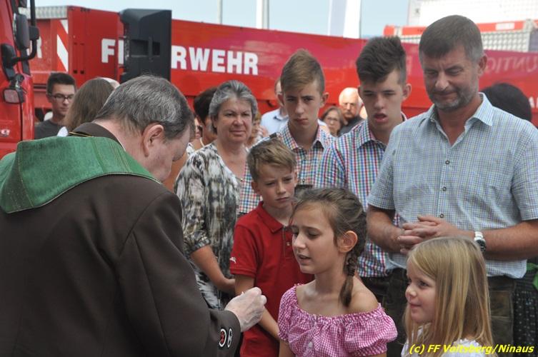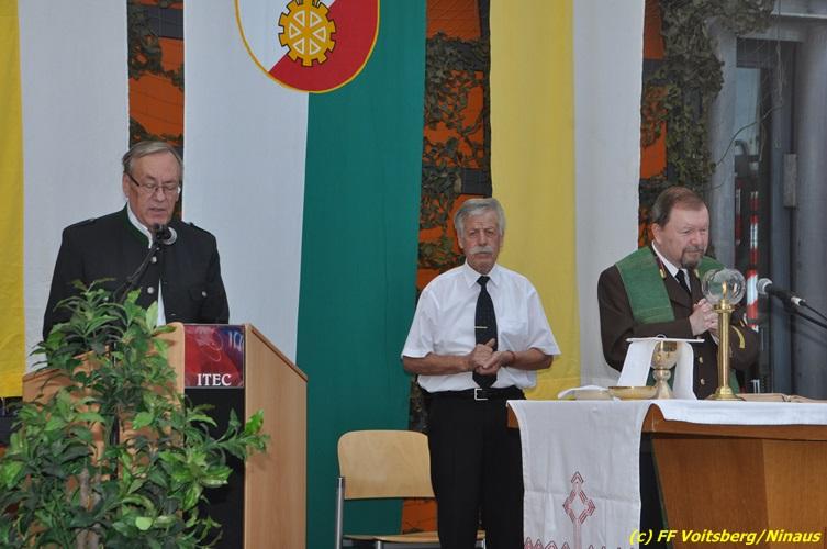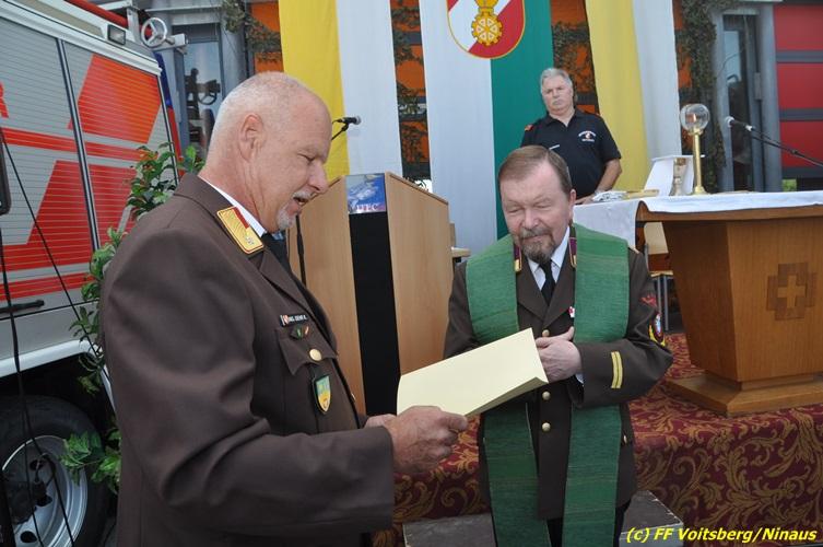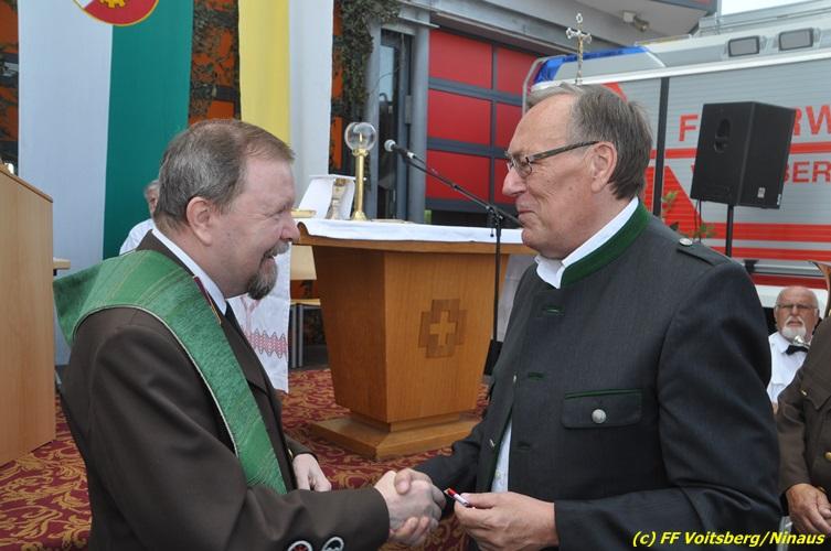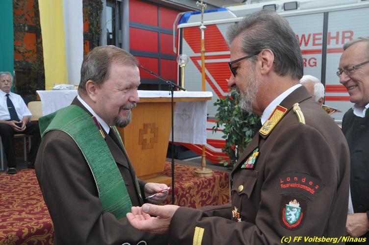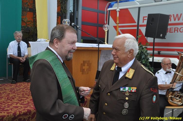 VOITSBERG, am 27.08.2017 Vor Beginn der Feldmesse im Rahmen des Zweitagefestes der FF Voitsberg wurde dem Mitglied der Stadtfeuerwehr Voitsberg, Generalvikar Dr. Erich Linhardt auf Grund seiner 20jährigen Mitgliedschaft die Verdienstmedaille in Silber der FF Voitsberg von Bürgermeister Ernst Meixner verliehen. Erste Gratulanten waren BerFwKdt LFR Engelbert Huber, Wehrkommandant ABI Ing. Klaus Gehr und ABI Alfred Jauk. Anschließend zelebrierte Dr. Erich Linhardt, wie alle Jahre zuvor, die bereits zur Tradition gewordene Feldmesse vor einer großen Schar an Bewohnern von Voitsberg und Umgebung.