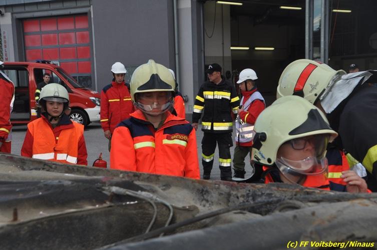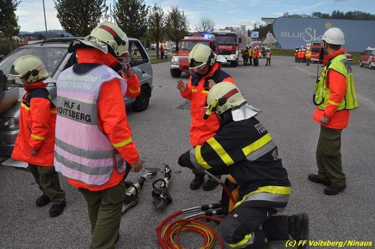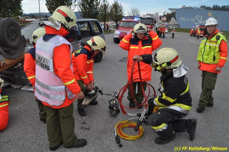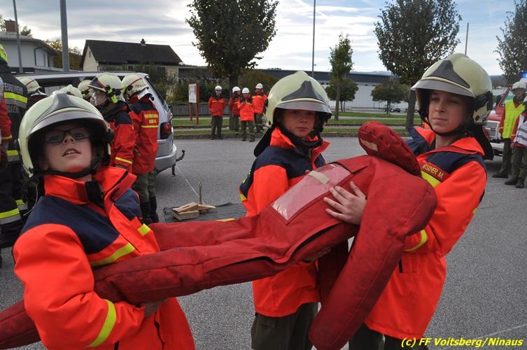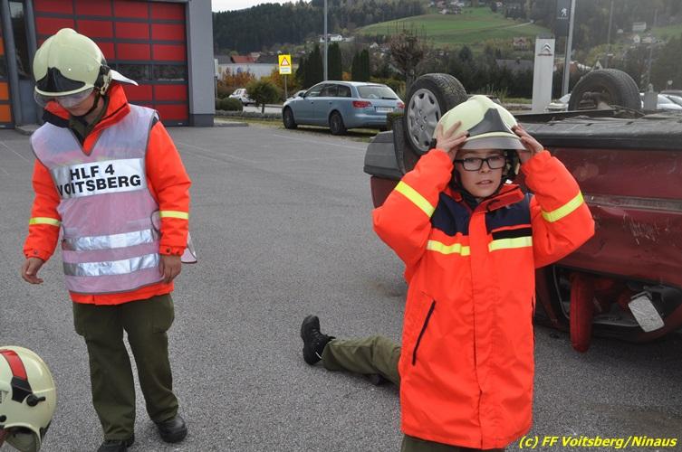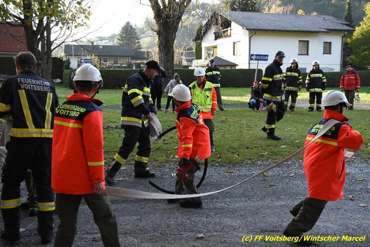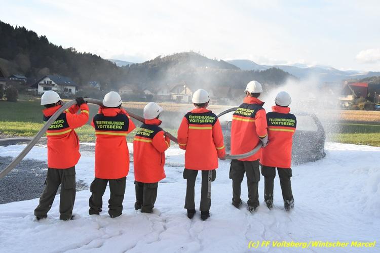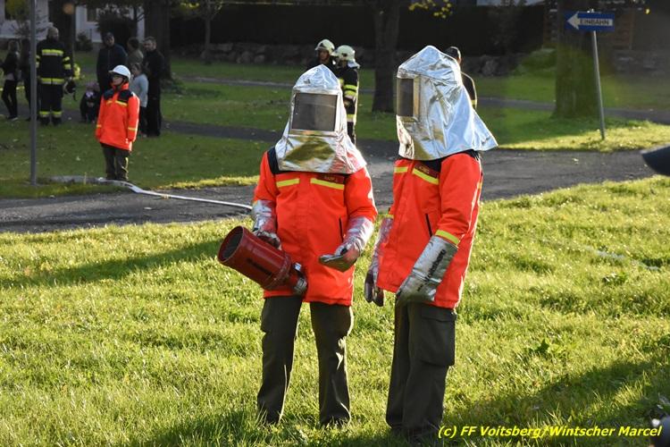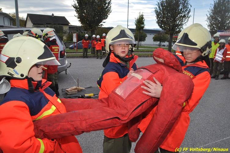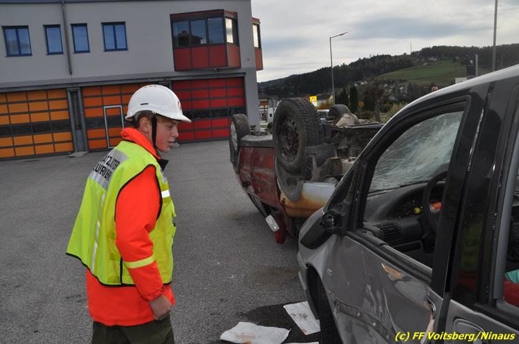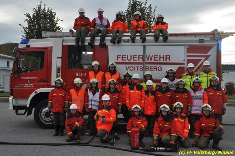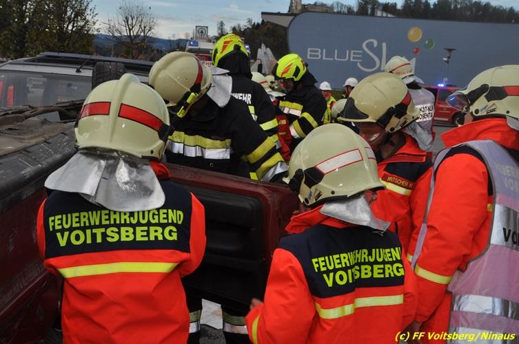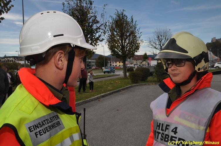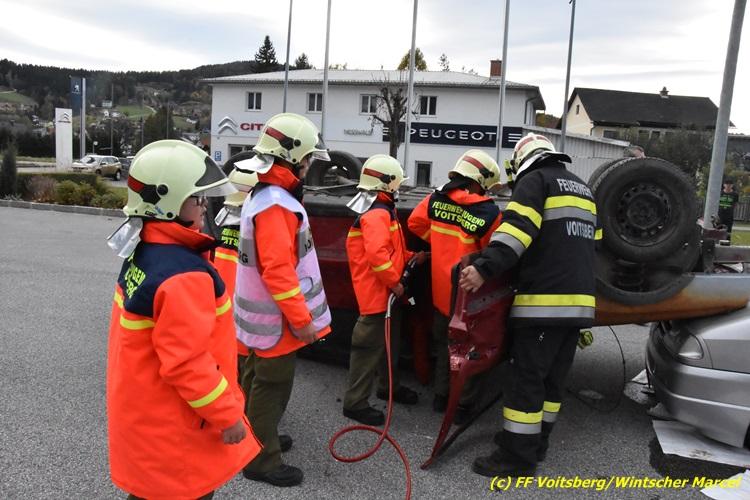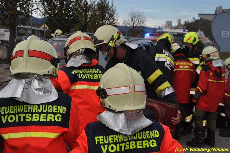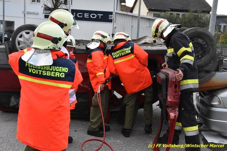 VOITSBERG, am 27.10.2017 Im Rahmen einer 24-Stunden-Übung der Feuerwehrjugend der Feuerwehren Afling, Bärnbach, Maria Lankowitz, Rosental und Voitsberg fand am 28. Oktober um 15 Uhr am Vorplatz des Rüsthauses Voitsberg eine technische Einsatzübung statt. Übungsannahme war nach einem Zusammenstoß zweier PKW die Rettung von zwei eingeklemmten Personen mit hydraulischer Schere und Spreizer, sowie die Absicherung der Unfallstelle und dem Herstellen eines Brandschutzes. Die 30 beteiligten Jugendlichen konnten die gestellten Aufgaben vor vielen anwesenden Verwandten und Feuerwehrfunktionären mit vollster Zufriedenheit der Ausbilder lösen. Weitere Übungsorte dieser 24-Stunden-Übung waren in Bärnbach, Afling und Rosental.