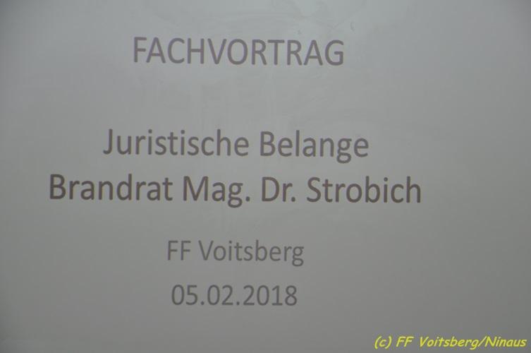 VOITSBERG, am 05.02.2018 Über Einladung des Kommandos der Freiwilligen Stadtfeuerwehr Voitsberg referierte am Montag, dem 5. Februar 2018 der Landesbeauftragte für Rechtsfragen des Landesfeuerwehrverbandes Steiermark Brandrat Mag. Dr. Gerhard Strobich im Lehrsaal des Rüsthauses Voitsberg über aktuelle Themen. An diesem Vortrag nahmen auch die Kameraden der Stadtfeuerwehr Bärnbach teil. Es wurde den Anwesenden seitens des Landesbeauftragten realitätsnahe Vorkommnisse dargebracht. Kamerad Dr. Gerhard Strobich war Rechtsanwalt und ist aktiver Feuerwehrmann der FF Trofaiach und wie er sagte, mit seinem Alter einer der ältesten, aktiven Atemschutzgeräteträger der Steiermark. Das Hauptaugenmerk des Sachgebietes ist auf die Betreuung der Feuerwehren, Feuerwehrverbände und des LFV, sowie der FeuerwehrkameradInnen in rechtlichen Angelegenheiten des Zivil-, Straf- und Verwaltungsrechtes sowie feuerwehrspezifischen Rechtsgebieten. In den letzten Jahren ist es bei den Feuerwehren verstärkt zu rechtlichen Problemen auf dem Gebiet des Haftungs- und Schadenersatzrechtes gekommen. Die praktische Erfahrung von Dr. Strobich als Rechtsanwalt bringt in Verbindung mit dem Fachwissen des aktiven Feuerwehrmannes und genauer Kenntnisse des Feuerwehrwesens in der rechtlichen Praxis Vorteile in vielen Belangen. Viele Fragen an Dr. Strobich seitens der Anwesenden unterstrichen die Wichtigkeit und das große Interesse solcher Vorträge. Nach diesem von vielen Neuigkeiten vorgebrachten Referat dankten die Wehrkommandanten ABI Ing. Klaus Gehr und HBI Bernhard Haller dem Vortragenden und luden zu einer gemeinsamen Jause.