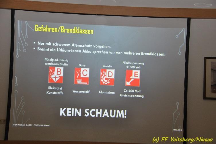VOITSBERG, am 12.03.2018 Die Stadtfeuerwehr Voitsberg führte einen Vortrag und Vorführung mit gas- und elektrobetriebenen Fahrzeugen durch. Die Kameraden Christoph Rothschedl (FF Mooskirchen) und Michael Gaisch (FF Stainz), welche anfangs von OBI Ing. Bernd Unger begrüßt wurden, referierten bei dieser Schulung fachkundig aus ihrem Berufsleben und den Erfahrungen aus dem Feuerwehrdienst und wiesen auf die Gefahren, als auch dem richtigen Verhalten im Einsatzfalle hin. Einige Kameraden der FF Krems nahmen ebenfalls an dieser Schulung teil. Besonderer Dank gebührt neben den Vortragenden den Stadtwerken Voitsberg, der Firma Fripertinger und der Firma Papst für die Bereitstellung von Fahrzeugen auszusprechen.
