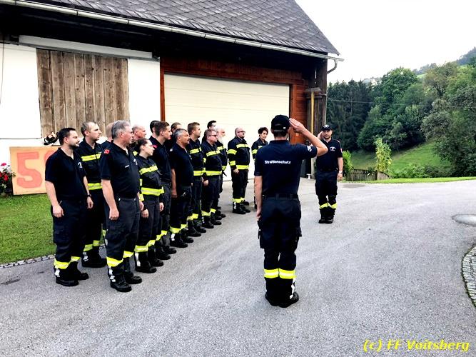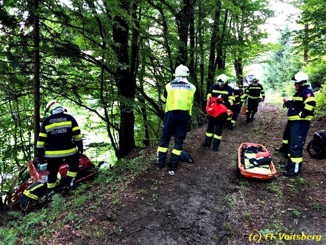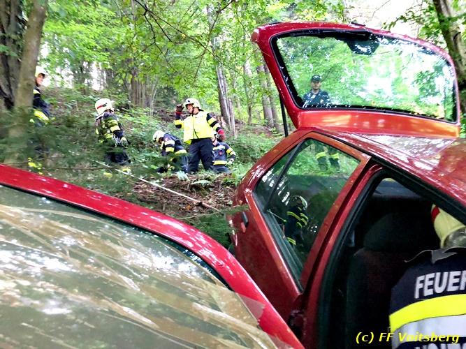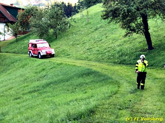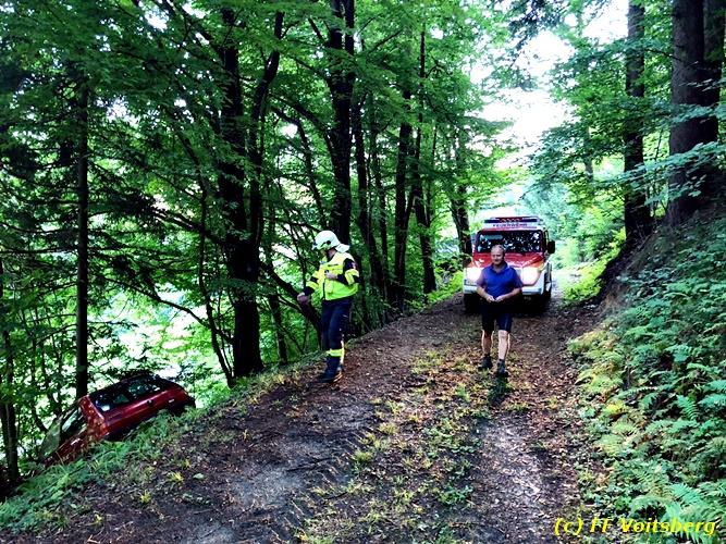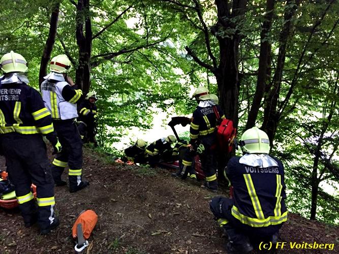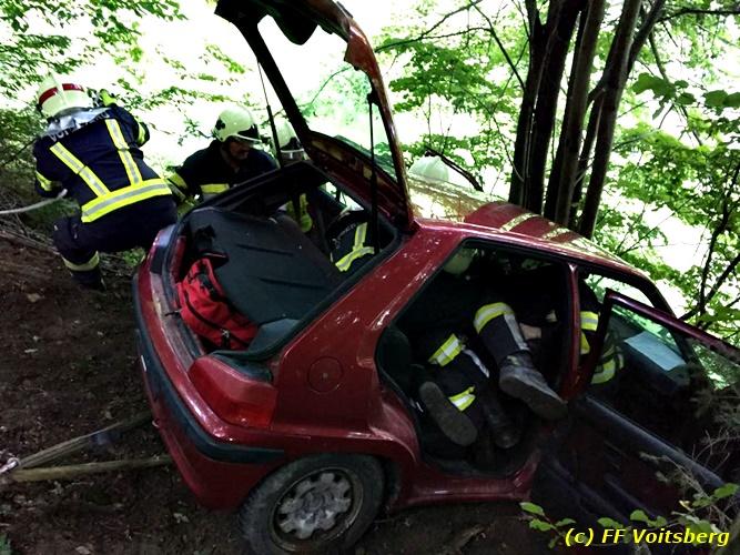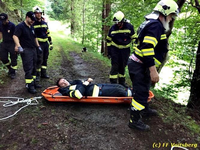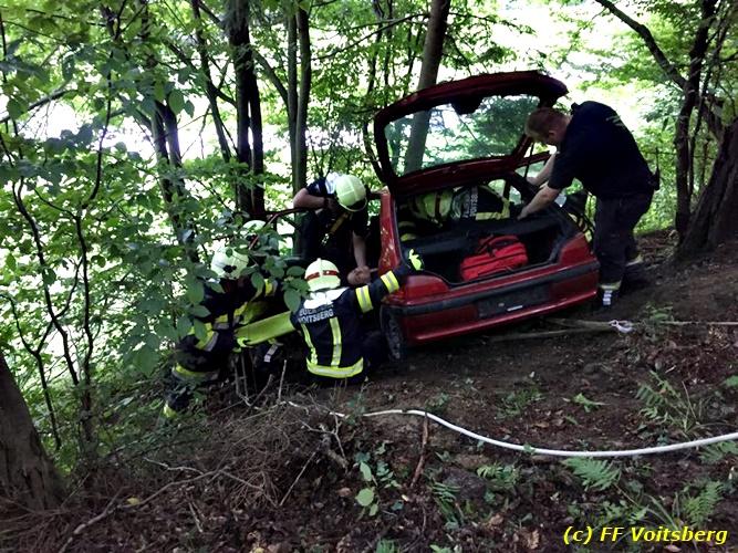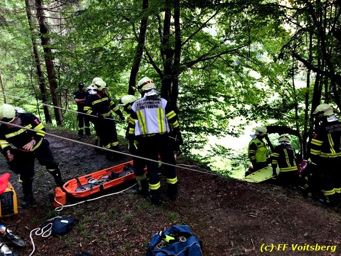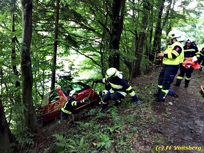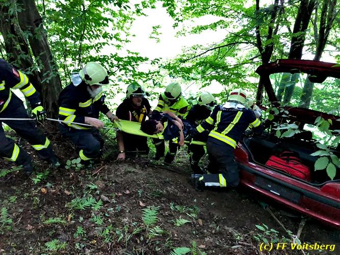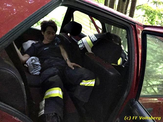 VOITSBERG, am 23.07.2018 Im Rahmen der Ausbildung fand am Montag, dem 23. Juli 2018 eine technische Einsatzübung bei der Familie Christof in der Gößnitzstrasse in Voitsberg statt. Übungsannahme war die Rettung von zwei Personen aus einem PKW, welcher in einem Wald abgestürzt war. Mit diversen Hilfsmitteln wurden die Personen gerettet und das verunfallte Fahrzeug geborgen.