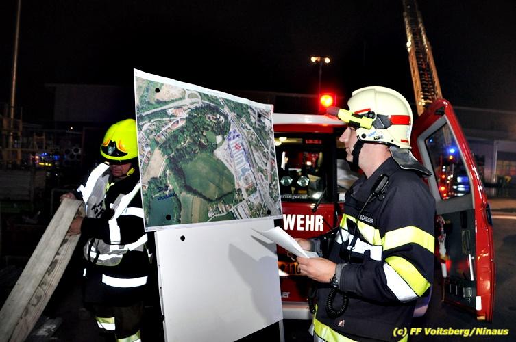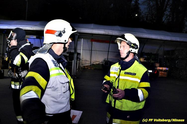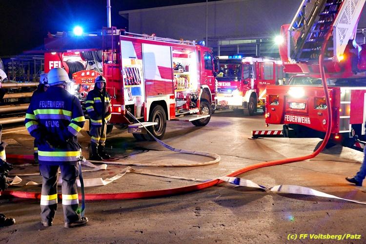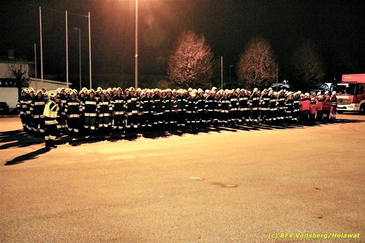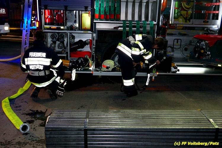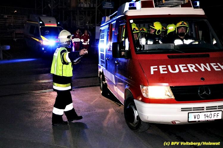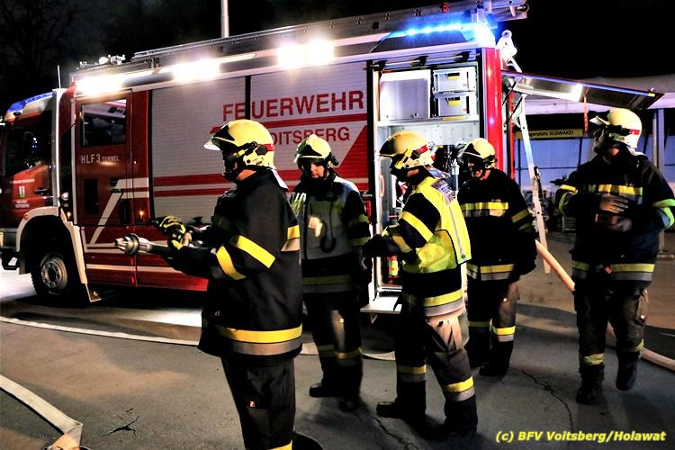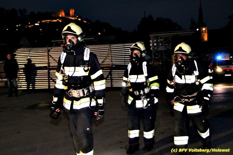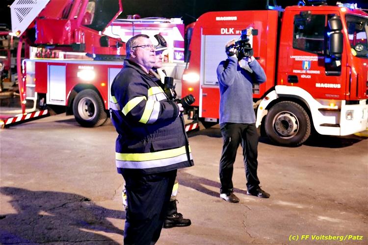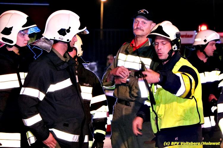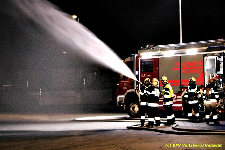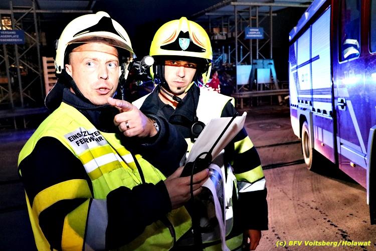 Der Feuerwehrabschnitt 2 des BFV Voitsberg veranstaltete am Montag, 15. Oktober 2018 bei der Firma Bauer in Voitsberg eine Abschnittsübung. Der Wehrkommandant der durchführenden Feuerwehr Voitsberg, BR Ing. Klaus Gehr konnte vor der Übung zahlreiche Übungsbeobachter bei der Übungserklärung begrüßen: Bürgermeister Ernst Meixner, Vizebürgermeister Walter Gaich, Stadtrat Franz Sachernegg, GR Werner Blumauer, GR Horst Kovacic, GR Johann Rauchegger, vom Roten Kreuz Voitsberg-Köflach BezirksrettungskdtStv. Florian Angerer und Elisabeth Jauk, das Team von Kanal3 und im speziellen die Vertreter der Firma Bauer mit ihrem Chef Otto Roiss. Gegen 18.30 Uhr wurde die Freiwillige Feuerwehr der Stadt Voitsberg über einen Brand bei der Firma Pumpen Bauer alarmiert, dass ein Teil einer Halle bereits in Vollbrand stehe und 5 Personen in den Hallen noch eingeschlossen seien bzw. die Halle nicht mehr verlassen konnten. Einsatzleiter OBI DI (FH) Bernd Unger alarmierte über Florian Voitsberg sofort die Feuerwehren des Abschnittes 2 sowie die Drehleiter der FF Köflach. Die Feuerwehr Voitsberg hat nach Eintreffen am Einsatzort sofort mit 2 Tanklöschfahrzeugen und HD-Rohr eine Erstbrandbekämpfung begonnen und ein Atemschutztrupp hat die Suche und das Retten von den vermissten Personen begonnen. Eine weitere Mannschaft hat eine Zubringleitung für den Wasserbezog vom zwei Kilometer entfernten Grafenteich zu errichten begonnen. Zwei Tragkraftspritzen haben die Wasserförderung über zwei B-Leitungen übernommen. Die nach der Reihe eintreffenden Wehren wurden vom Einsatzleiter Unger Bernd über das derzeitige Ausmaß informiert und sie erhielten jeweils ihre Einsatzbefehle. Vordergründig war natürlich die Suche und Rettung der weiteren vermissten Personen. Die Drehleiter Köflach mit dem Wasserwerfer hat den Brandherd aus 30 Meter Höhe bekämpft. Weiters wurden weitere 3 Wasserwerfer zur Brandbekämpfung eingesetzt. Die Wehren des Abschnittes 2 (Krems, Bärnbach, Afling Geistthal, Kainach, Stallhofen und Södingberg) wurden für weitere Löschangriffe der Halle wie auch zum Schützen der angebauten und angrenzenden Hallen beauftragt. Bei der Schlusskundgebung und nach der Meldung an Abschnittskommandanten ABI Alfred Jauk teilte BR Gehr, Kommandant der FF Voitsberg (durchführende Wehr der Abschnittsübung) mit, dass die Maxime der Übung die Bekämpfung eines Industriebrandes sowie die Wasserförderung in großen Mengen gewesen sei. Unter den Ehrengästen konnte ABI Alfred Jauk den Betriebsleiter der Firma Bauer Herrn Otto Roiss, Bereichskommandantstellvertreter BR Ing. Klaus Gehr, für alle Mitglieder des Bereichsfeuerwehrausschusses ABI d.V. Günter Höller, EBR Robert Klampfl, EABI Rudolf Gargitter, das Rote Kreuz unter Bezirksrettungskommandantstellvertreter Florian Angerer und den Brandschutzbeauftragten HBM Herbert Gratzer begrüßen. Zugleich wurde mitgeteilt, dass 147 Mann, 4 Wasserwerfer, die Drehleiter Köflach sowie 3 Atemschutztrupps und alle weiteren zur Verfügung stehenden Einsatzfahrzeuge des Abschnittes 2 eingesetzt waren. Nach dem Antreten wurde mit den zuständigen Gruppenkommandanten eine Nachbesprechung der Übung abgehalten, um etwaige Fehler oder Verbesserungen aufzeigen zu können. Anschließend wurde alle Übungsteilnehmer seitens der Firma Pumpen Bauer zur Verpflegung ins Rüsthaus Voitsberg eingeladen. Text: Artur Holawat, BFV Voitsberg Fotos: Artur Holawat/BFV Voitsberg, Walter Ninaus/FF Voitsberg, Franz Patz/FF Voitsberg
