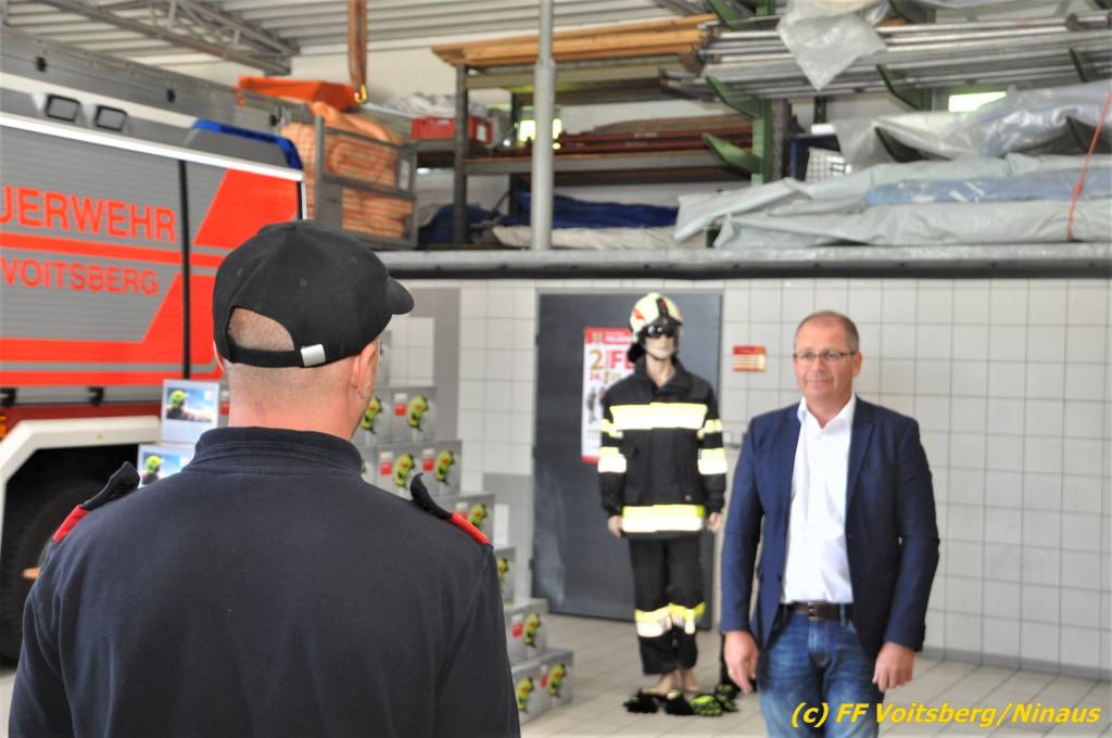 VOITSBERG, am 17.08.2019 Die Kameradinnen und Kameraden der FF Voitsberg trafen sich am Samstag, 17. August 2019 zu zwei erfreulichen Anlässen im Rüsthaus. Zum ersten stattete der neue Bürgermeister Mag. (FH) Bernd Osprian einen ersten offiziellen Antrittsbesuch ab und in weiterer Folge wurde an alle KameradInnen ein neuer Einsatzhelm übergeben. Wehrkommandant BR Ing. Klaus Gehr begrüßte Bgm. Osprian und brachte einen Rückblick über die Ausstattung der Mitglieder der letzten Jahre. Er betonte den hohen finanziellen Aufwand für diese Beschaffungen. So wurden in den letzten 6 Jahren für die Einsatzanzüge 1+2, Einsatzhelme, Handschuhe, Dienstbekleidung D 3 (blau) insgesamt 145.000,00 Euro investiert. Dieser hohe Betrag wurde seitens der Stadtgemeinde Voitsberg, durch Erlöse aus den Festveranstaltungen, Spenden, Beiträgen aus verrechenbaren Einsätzen, Förderungen des LFV und aus dem Budget der FF Voitsberg aufgebracht, wofür allen Dank auszusprechen gilt. Bürgermeister Osprian stellte sich der angetretenen Mannschaft vor. Er sicherte zu, dass er sich, wie schon bisher durch seinen Vorgänger Ernst Meixner, für die Belange der Feuerwehr einsetzen und die finanziellen Mittel aus dem Gemeindebudget bereitstellen wird. Er dankte für die erbrachten Leistungen und lud abschließend zu einem gemeinsamen Mittagessen.