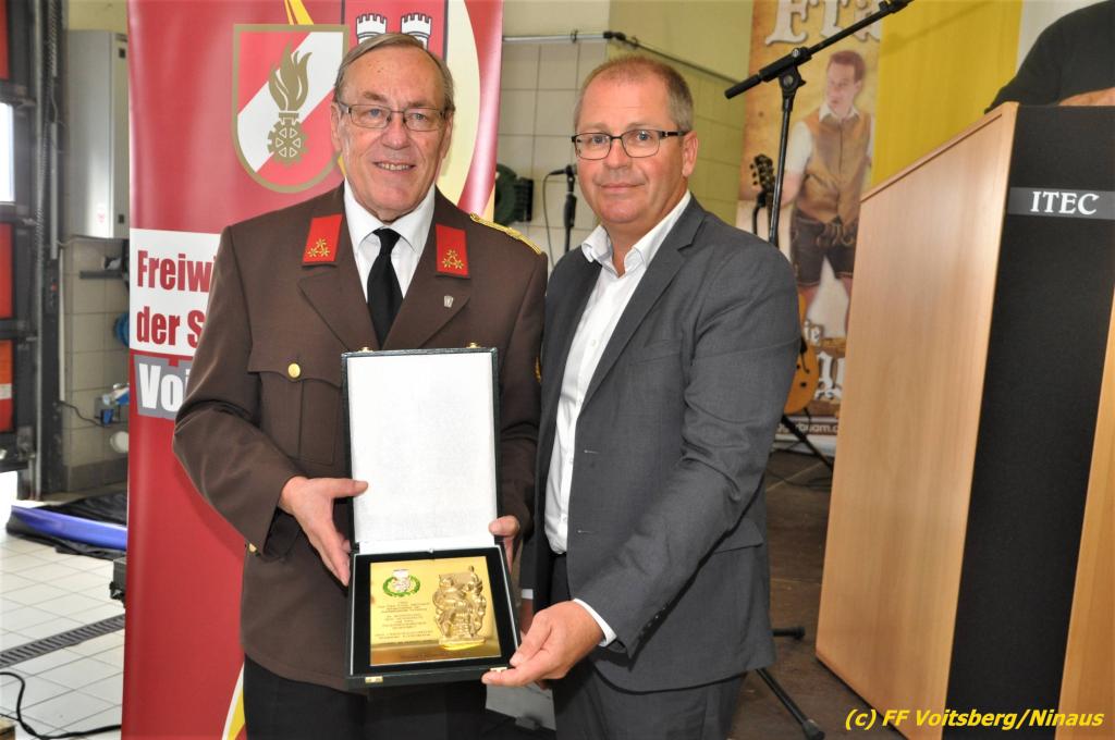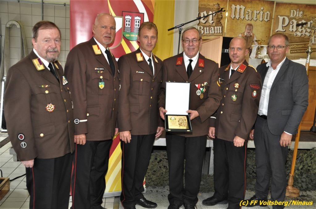 VOITSBERG, am 25.08.2019 Im Anschluss erfolgte eine Verleihung einer besonderen Auszeichnung. Altbürgermeister Ernst Meixner wurde über Antrag von BR Ing. Klaus Gehr von OBR Christian Leitgeb seitens des Landesfeuerwehrverbandes Steiermark mit der Florianiplakette in Gold ausgezeichnet. Diese Auszeichnung ist eine der höchsten, welche an Personen verliehen werden kann, welche nicht im Aktivstand einer Feuerwehr geführt werden.
