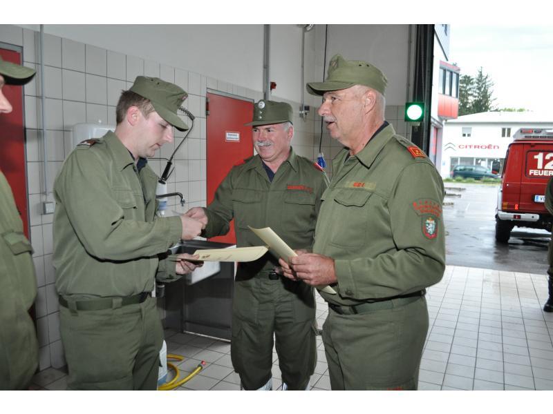 VOITSBERG, am 10.06.2013 Vor der Übung wurden im Rüsthaus die Kameraden EABI Rudolf Gargitter für seine hohe Auszeichnung der Republik Österreich (siehe 03.06.) und BM d. F. Rudolf Deutschmann zur Vollendung seines 60. Geburtstages vom Wehrkommandanten HBI Ing. Klaus Gehr und von HBM Karlheinz Buchegger gratuliert. Weiters wurden die Kameraden LM Harald Sury für seine 30jährige Mitgliedschaft mit der Verdienstmedaille in Gold der FF Voitsberg und LM d. F. Christian Buchegger für seine 10jährige Mitgliedschaft mit der Verdienstmedaille in Bronze der FF Voitsberg ausgezeichnet.