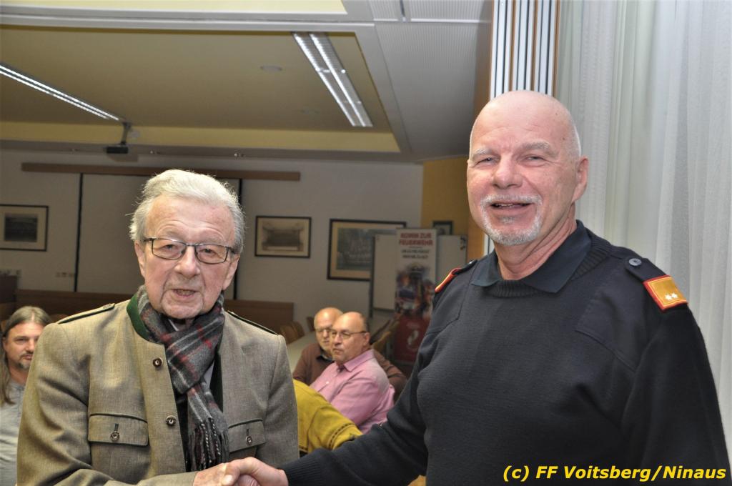 VOITSBERG, am 28.10.2019 Karl Strablegg, langjähriger Landesfeuerwehrkommandant der Steiermark (1976-1996), Vizepräsident des Österr. Bundesfeuerwehrverbandes, Bezirksfeuerwehrkommandant und Kommandant der Stadtfeuerwehr Voitsberg lud aufgrund seiner Vollendung des 90. Lebensjahres die Mitglieder seiner Stammfeuerwehr in den Schulungsraum der FF Voitsberg. Wehrkommandant BR Ing. Klaus Gehr begrüßte den Jubilar und skizzierte ausführlich seinen Werdegang in der FF Voitsberg, dem Bereichsfeuerwehrverband, dem Landesfeuerwehrverband und dem Österr. Bundesfeuerwehrverband. Er war mit seiner Denkensweise immer einen Schritt voraus. Karl Strablegg dankte in Worten der Freunde seinen Wehrkameraden und brachte einige „Zuckerl“ aus seinen Tätigkeiten aus der Familie, seinem Leben als Fleischhauermeister und seiner einzigartigen Karriere bei der Feuerwehr. Abschließend lud er zu einem Abendessen, wofür sich die KameradInnen auf der herzlichste bedanken möchten und noch viele gesunde Jahre dem Jubilar wünschten.