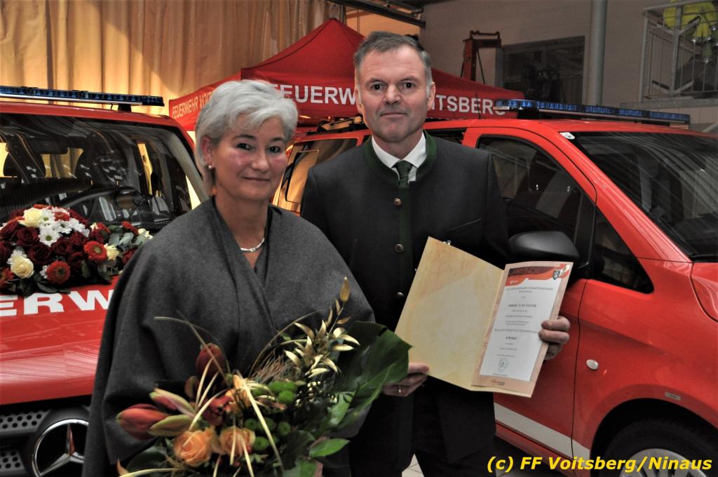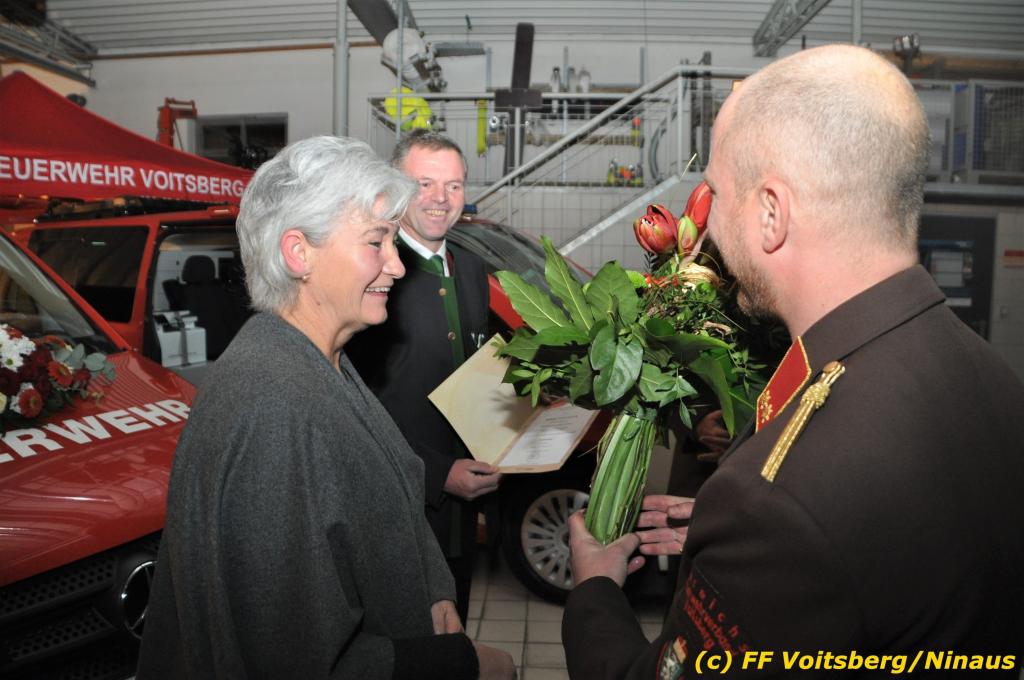 Das Ehepaar Schlosser wurde anschließend für ihre stetige Bereitschaft, ihr Anwesen als Übungsobjekt sowie Fahrzeuge und Gerätschaften zur Verfügung zu stellen, mit der Medaille für verdienstvolle Zusammenarbeit in Bronze des LFV Steiermark seitens OBR Christian Leitgeb und Brandrat Klaus Gehr ausgezeichnet. Des Weiteren wird die Mannschaft bei den Übungen immer wieder kulinarisch bestens versorgt und mit ausgezeichneten Fruchtsäften vom eigenen Obstbaubetrieb verwöhnt