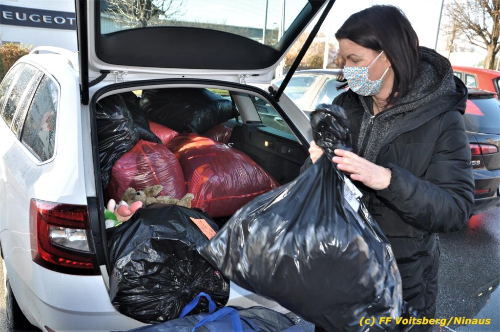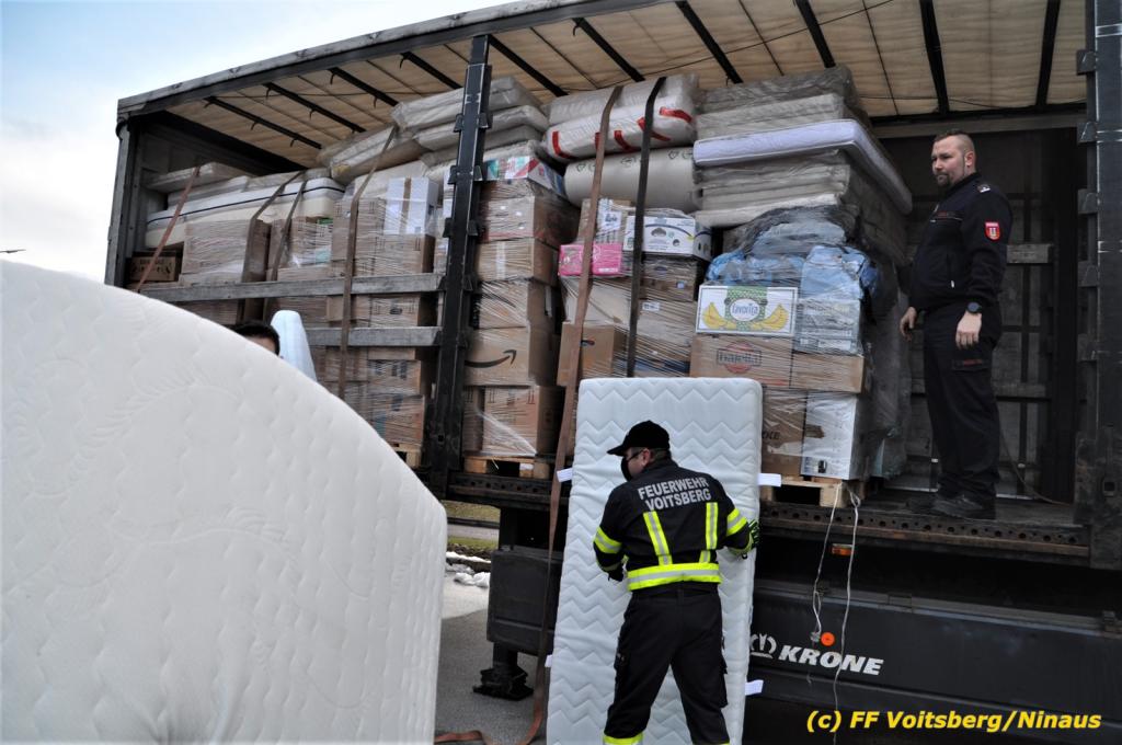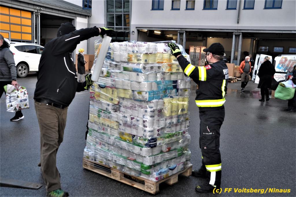 Die Aktion startete am Dienstag, 5. Jänner um 8 Uhr und die FF Voitsberg stand mit bis zu 25 KameradInnen bereit, die Waren von der Bevölkerung zu übernehmen, zu sortieren und zu palettieren. Es war aber so viel an Spendenfreudigkeit festzustellen, dass schon am Dienstag am Nachmittag die Spendenaktion, welche bis Mittwochmittag geplant war, aus Kapazitätsgründen abgebrochen werden musste. Der ursprünglich eingeplante Sattelschlepper war bereits voll beladen, sodass ein zweiter bestellt wurde.