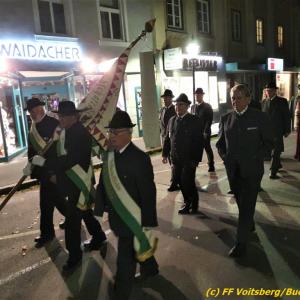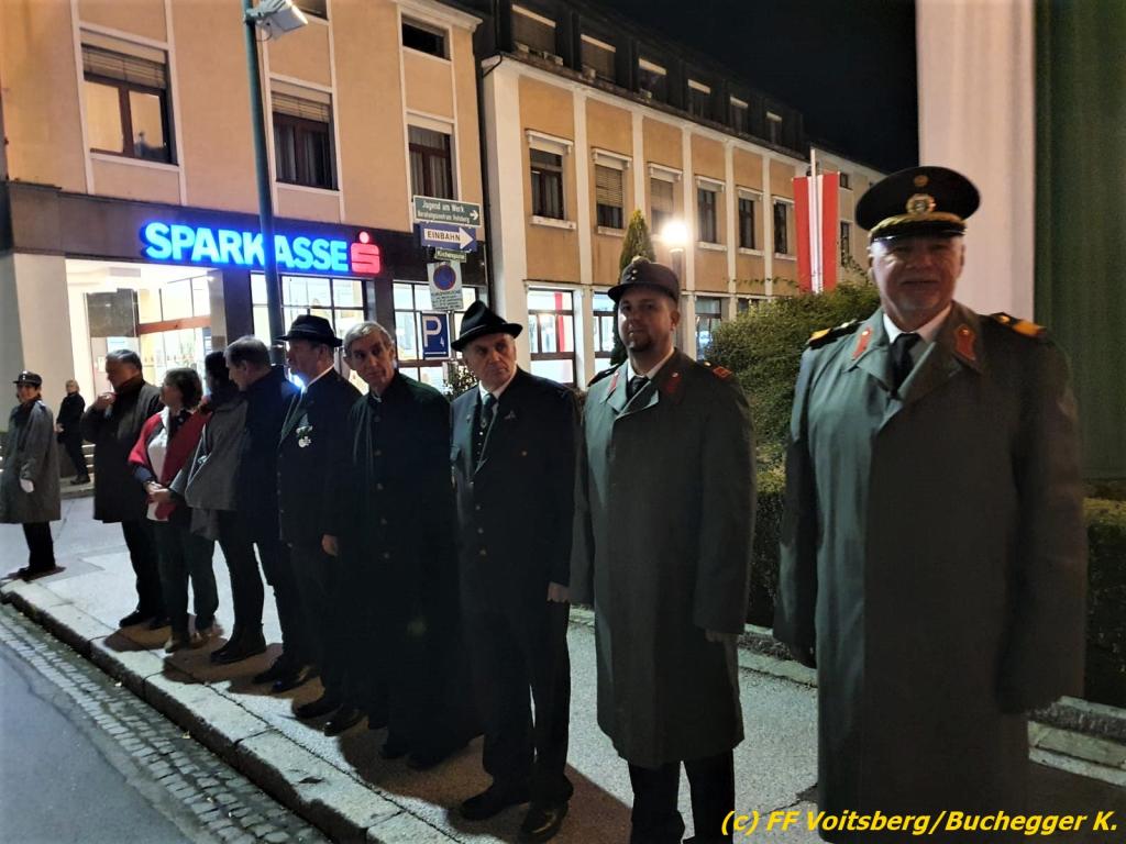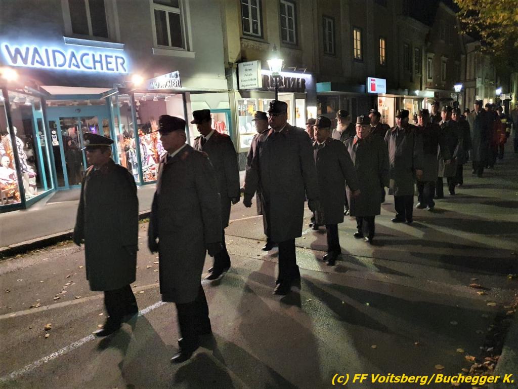 Nach einer Gedenkmesse, zelebriert vom Seelsorger Mag. Josef Paier in der St. Josefskirche, marschierte der Gedenkzug, bestehend aus Abordnungen des Kameradschaftsbundes Voitsberg, der FF Voitsberg, der FF Krems, der Feuerwehrjugend Voitsberg, der Alt-Kainacher Ritterschaft und der Bergkapelle Hödlgrube-Zangtal zum Kriegerdenkmal in der Bahnhofstrasse.