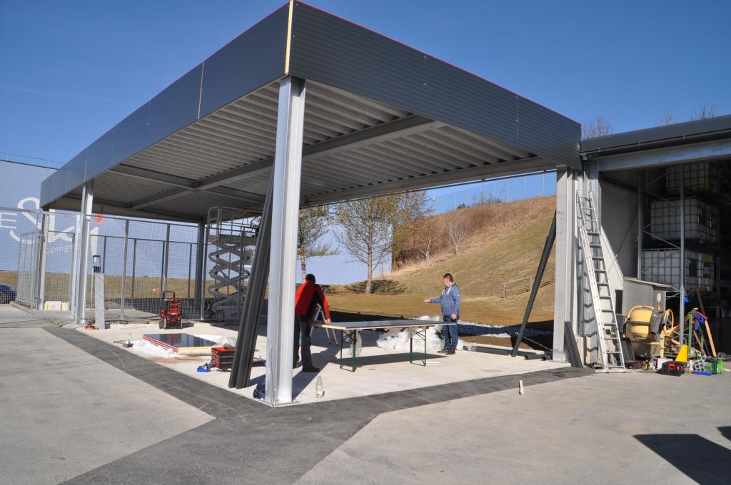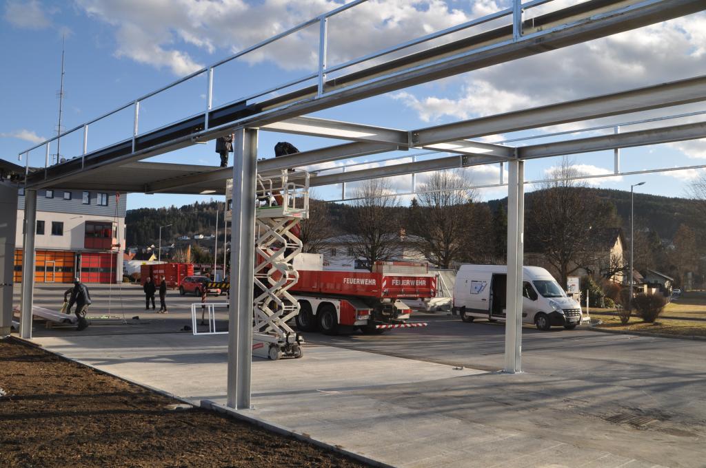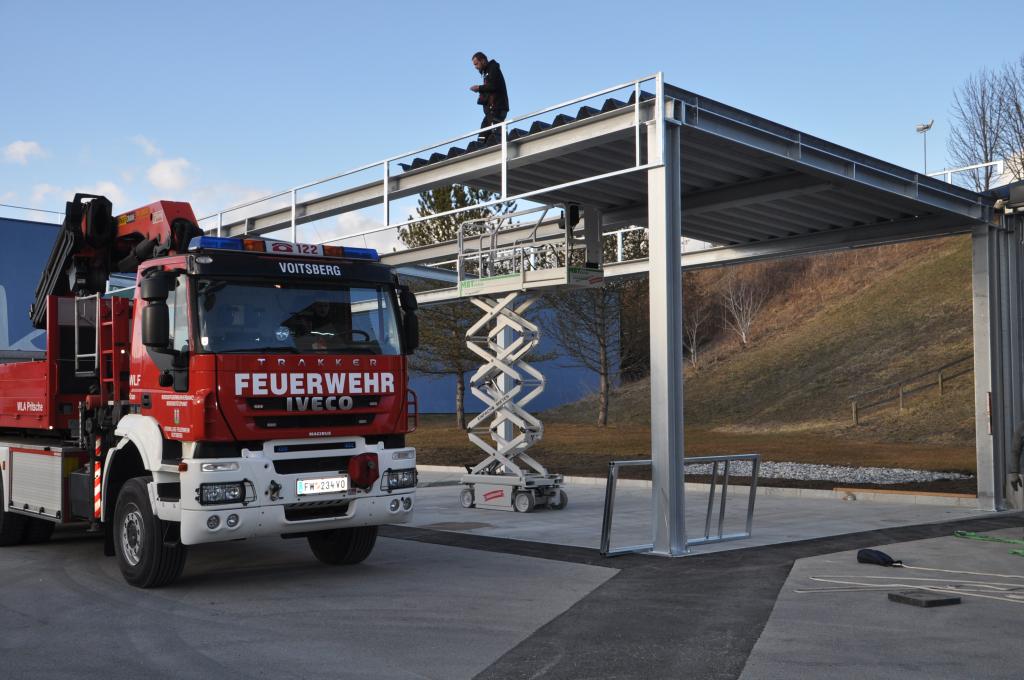 Nachdem der FF Voitsberg Anfang 2021 eine Mulde für den Wechsellader durch den Bereichsfeuerwehrverband Voitsberg zur Verfügung gestellt wurde, galt es diese nun auch geschützt zu lagern. Hierfür wurde gemeinsam mit der Stadtgemeinde ein Zubau in Form eines Flugdaches geplant und nun umgesetzt.