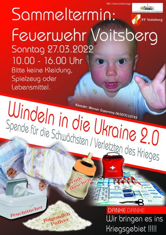 VOITSBERG, am 27.03.2022 Einige Paletten der als notwendig gebrauchten, angeführten Artikel wurden dankeswerterweise wieder für die notleidenden Kinder in der Ukraine gesammelt.