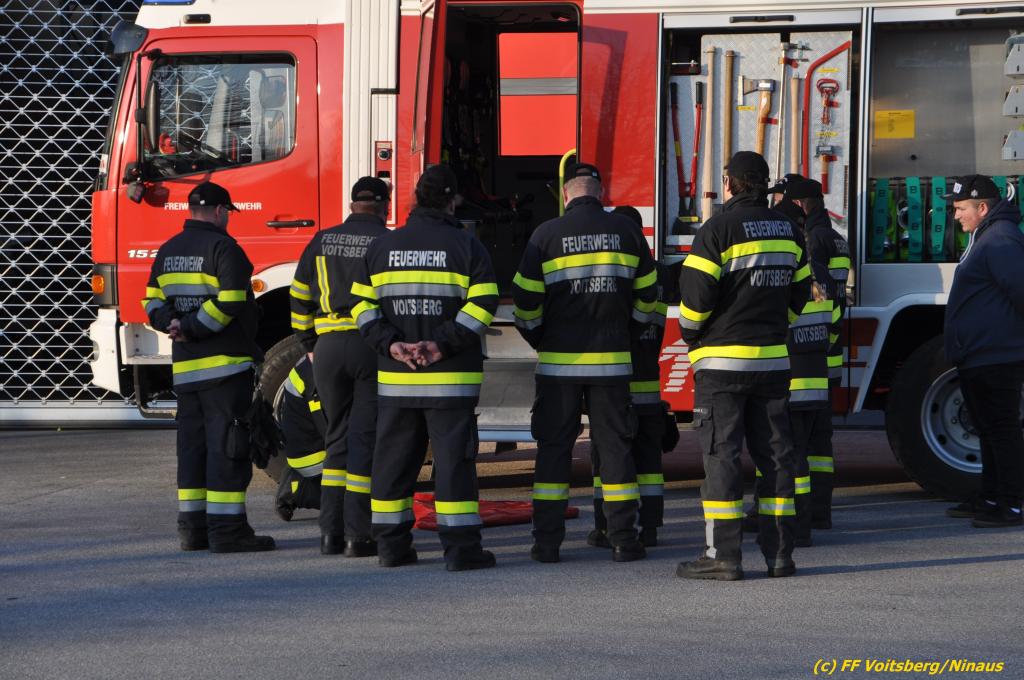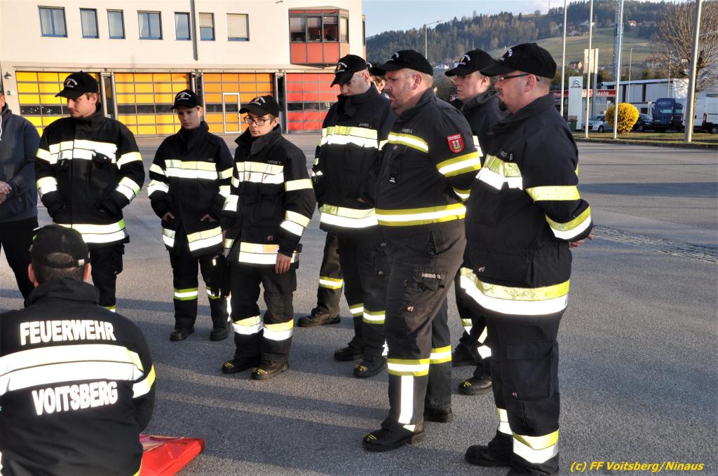 VOITSBERG, am 04.04.2022 Beim Feuerwehrhaus fand am Montag, 4.4.2022 eine technische Übung statt. Neben der Gerätekunde wurden noch mit C42 Schläuchen, dem Hochstrahlrohr, dem Rauchvorhang und der 3teiligen Schiebeleiter geübt.