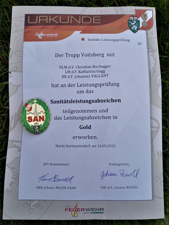 VOITSBERG, am 24.09.2022 Drei Mitglieder unserer Wehr (Buchegger Christian, Katharina Gogg, Johannes Vallant) unterzogen sich der Sanitätsleistungsprüfung in Gold und haben diese bestanden. Wir gratulieren dem Trupp!