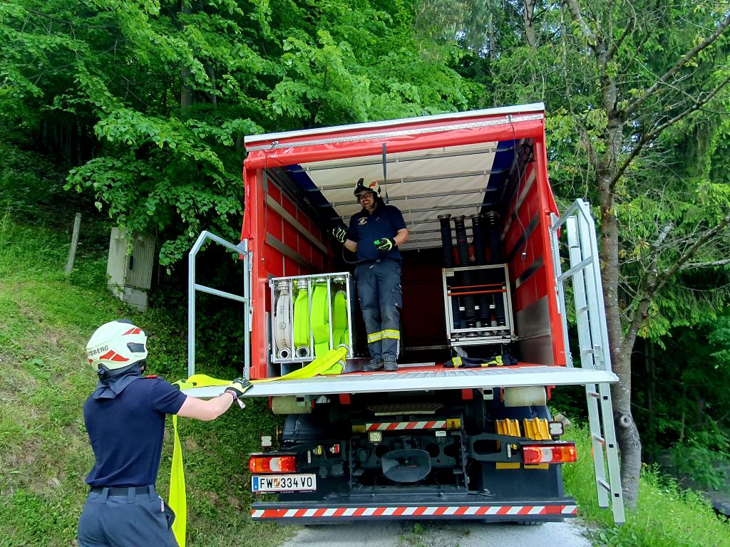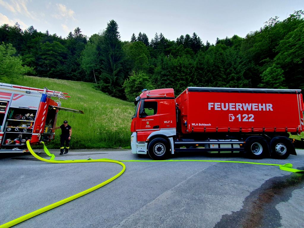 Während die Besatzung des HLF 4 einen Löschangriff mit 2 C-Rohren durchführte, wurde mit dem erst vor einigen Monaten neu angeschafften WLF 2 mit WLA-Schlauch die Zubringleitung verlegt. Hier konnten in knapp 6 Minuten 560 Meter und rund 60 Höhenmeter überwunden werden.