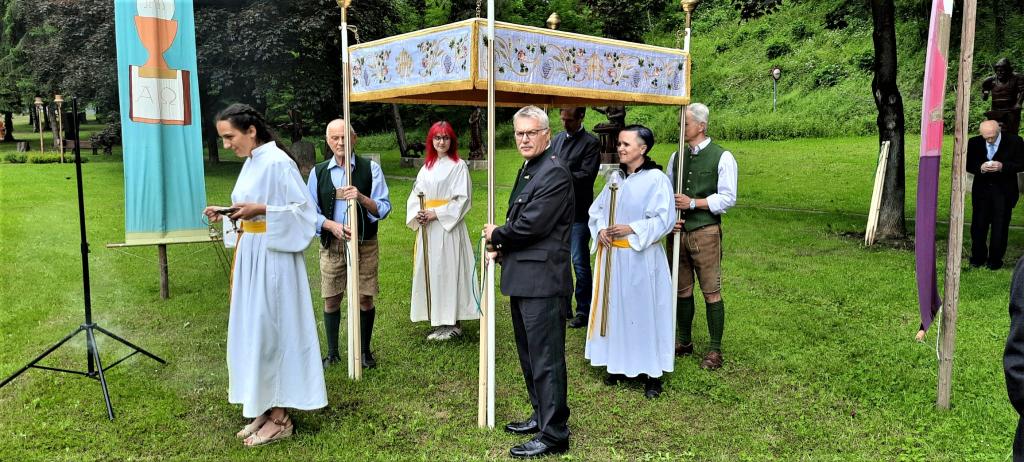 Nach der von Pfarrer Mag. Gerald Krempl abgehaltenen Messe im Schlosspark Greißenegg marschierten alle Teilnehmer unter Vorantritt der Bergkapelle Hödlgrube-Zangtal in einer Prozession zum Voitsberger Hauptplatz.