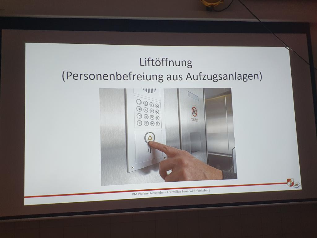 VOITSBERG, am 05.02.2024 Aufgeteilt auf zwei Gruppen wurden von BM Alexander Wallner und LM DI Markus Roßmann die Neuerungen und Möglichkeiten für Personenrettungen aus Liftanlagen sowie versperrten Wohnungen vorgestellt und im Anschluss praktisch beübt.