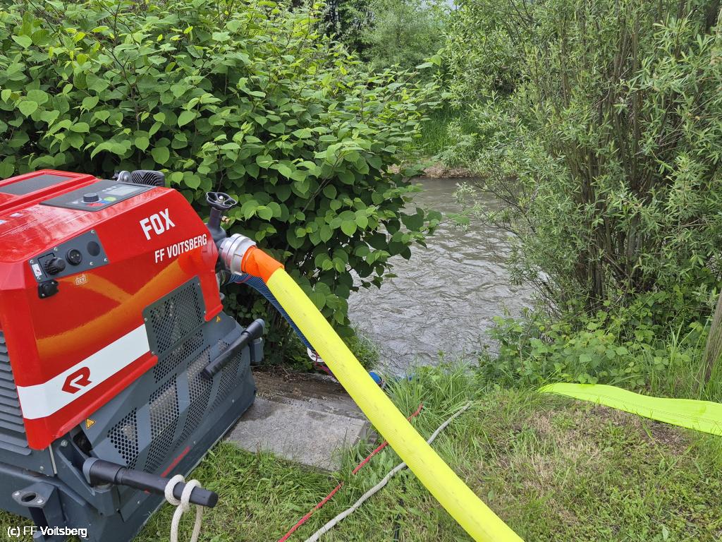 Ebenso wurden die Errichtung einer Zubringleitung mittels Tragkraftspritze und Schmutzwasserpumpe aus der Kainach sowie der Einsatz von zwei Wasserwerfern beübt.