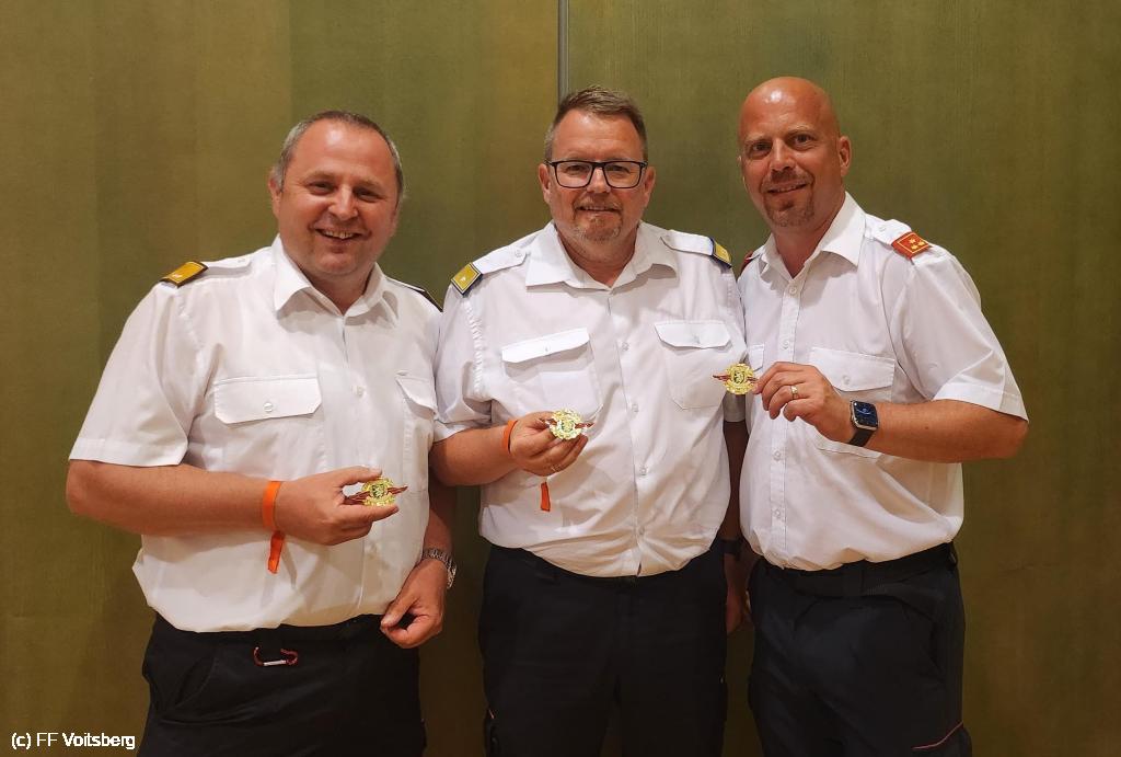Im Zuge des Bewerterabends wurden unsere Kameraden BR d. F. Prof. DI Johannes Vallant und HBI DI (FH) Bernd Unger mit der Bewerterspange in Gold für 75 sowie ABI d. V. Hendrik Wolf für 100 Bewertertätigkeiten ausgezeichnet.
