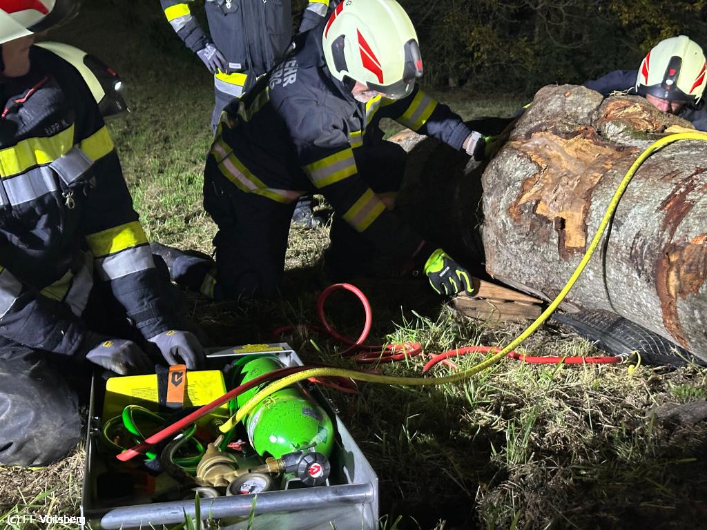 Ein verletzter Arbeiter wurde von einem umfallenden Baumstamm getroffen und darunter eingeklemmt.