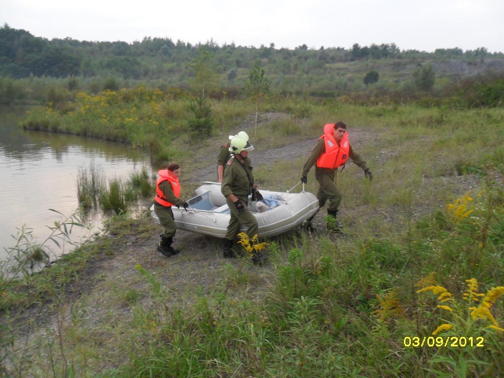 Abschließend fand mit dem Schlauchboot unter Ausnützung der örtlichen Gegebenheiten die Bergung einer Person aus dem Schilfgürtel des Teiches statt.