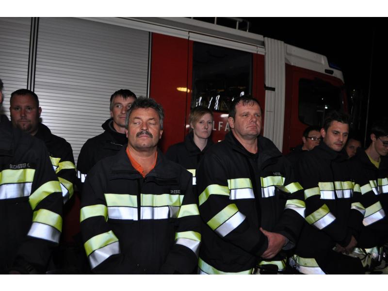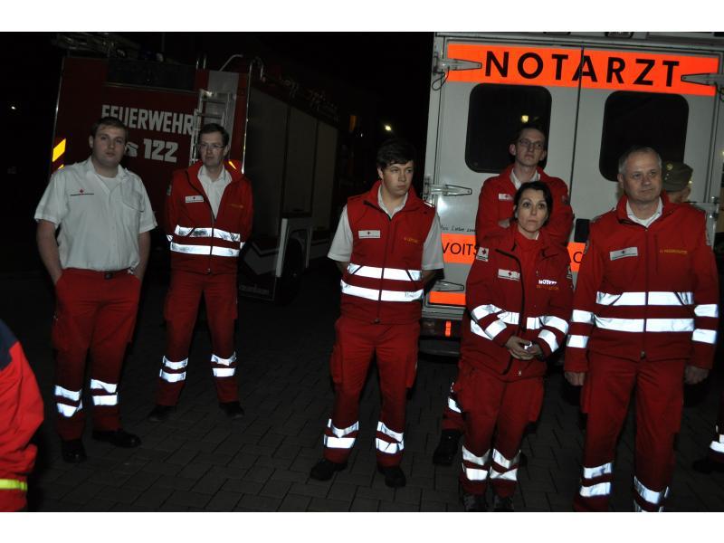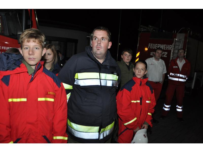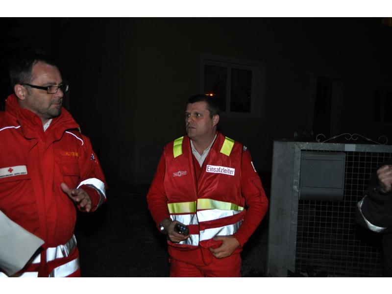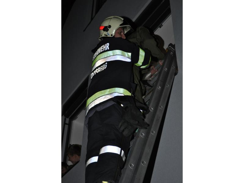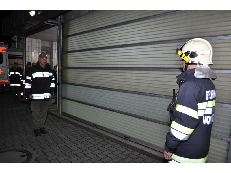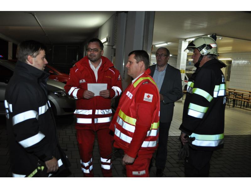 VOITSBERG, am 14.10.2013 Diesmal wurde die Einsatzzentrale des Roten Kreuzes Voitsberg beübt. Übungsannahme war ein Kellerbrand, bei welchem der Westteil des Objektes betroffen war. Die Brandmeldeanlage meldete an Florian Steiermark den Brand mit der Zusatzmeldung das sich noch 6 Personen im Haus befinden. Die alarmierte FF Voitsberg begann sofort nach Erkundung des Einsatzleiters BI d. F. Ing. Bernd Unger mit dem Brandangriff unter schwerem Atemschutz im Keller, wobei eine Person mit einer Rauchgasvergiftung geborgen und dem Roten Kreuz übergeben wurde. Eine weitere Person wurde mit Hilfe des Sprungretters vom Dach gerettet. Vier vom Brand überraschte Rotkreuzhelfer waren in den Schlafräumen im 1. Stock eingeschlossen und konnten diese nur über einen hergestellten Leiterweg verlassen. Gleichzeitig wurden die in den Garagen geparkten Einsatzfahrzeuge von den diensthabenden Rotkreuzmitarbeitern in Sicherheit gebracht um die Einsatzbereitschaft zu gewährleisten. Bei der abschließenden Schlussbesprechung meldete der Einsatzleiter dem Wehrkommandanten HBI Ing. Klaus Gehr die erfolgreiche Beendigung der Übung. Dieser bedankte sich für die Bereitstellung des Objektes und die Vorbereitung durch OBI Michael Münzer und LM d. S. Christoph Amberger. Der „Chef“ des Roten Kreuzes Voitsberg und der FF Voitsberg Bürgermeister Ernst Meixner lobte die gute Zusammenarbeit und zeigte sich sehr stolz über den Übungsverlauf. Der Brandschutzbeauftragte Franz Sommer erläuterte den Ablauf und lud namens des ÖRK alle Übungsteilnehmer zu einer gemeinsamen Gulaschsuppe mit Getränken ein.