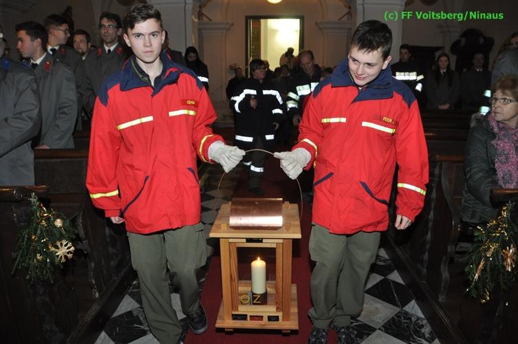 VOITSBERG, am 23.12.2015 Das Friedenslicht aus Bethlehem wurde heuer für den Bereich Voitsberg in der Josefskirche in Voitsberg von Dechant und Stadtpfarrer Mag. Gerald Krempl gesegnet und mit Unterstützung von LFR Engelbert Huber an die Feuerwehrjugend ausgegeben. Über 200 Teilnehmer an diesem besinnlichen Zusammentreffen zeigen die gute Jugendarbeit im Bereich auf und lassen uns beruhigt in die Zukunft sehen, was den Nachwuchs in den Feuerwehren betrifft. Organisiert wurde diese Veranstaltung von der FF Voitsberg mit den Jugendbeauftragten Rene Sorger und Peter Kremaucz in Zusammenarbeit mit dem Bereichsbeauftragten Harald Sorger. Nach Grußworten des Voitsberger Bürgermeisters Ernst Meixner, LFR Engelbert Huber und OBI Harald Sorger im Klosterhof stärkten sich die Teilnehmer in den Pfarrräumlichkeiten mit heißen Getränken und Mehlspeise und fuhren anschließend in ihre Standorte mit dem Friedenslicht zurück, um es an die Bevölkerung weiter zu geben.