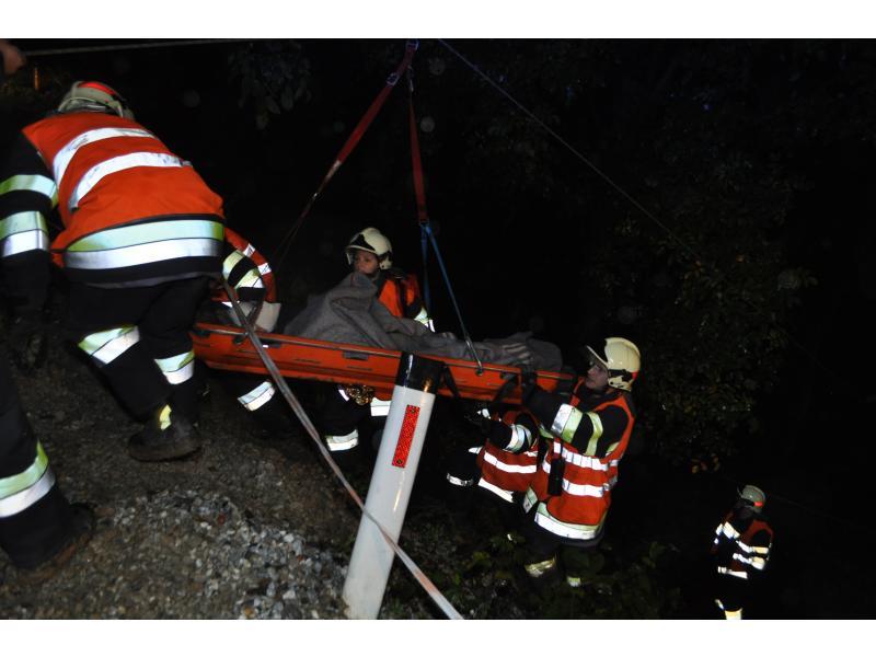 VOITSBERG, am 30.09.2013 Übungsannahme war ein Verkehrsunfall mit einem über eine 10 m hohe Böschung gestürzten PKW. Zwei Personen wurden aus dem Fahrzeug geschleudert und weitere zwei Personen waren im PKW eingeklemmt, wobei eine Person bewußtlos war. Nach der Erkundung durch den Einsatzleiter Christian Rozic begann man mit dem Aufbau eines zweifachen Brandschutzes, mit der Versorgung der Verletzten durch die Feuerwehrsanitäter, mit dem Bergen der Eingeklemmten unter Verwendung eines Spreitzers sowie mit dem Aufseilen mittels Korbtrage und Übergabe an den Rettungsdienst. Die Übungsvorbereitung lag in den Händen von HBM Karlheinz Buchegger und LM Alexander Kröpfl. Nach der abschließenden Übungsnachbesprechung bedankte sich HBM Buchegger beim Besitzerehepaar Ofner für die Bereitstellung ihres Grundstückes und für die Einladung zu einer abschließenden Jause mit Getränken namens der FF Voitsberg mit einem Blumenstrauß.