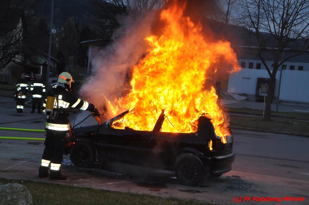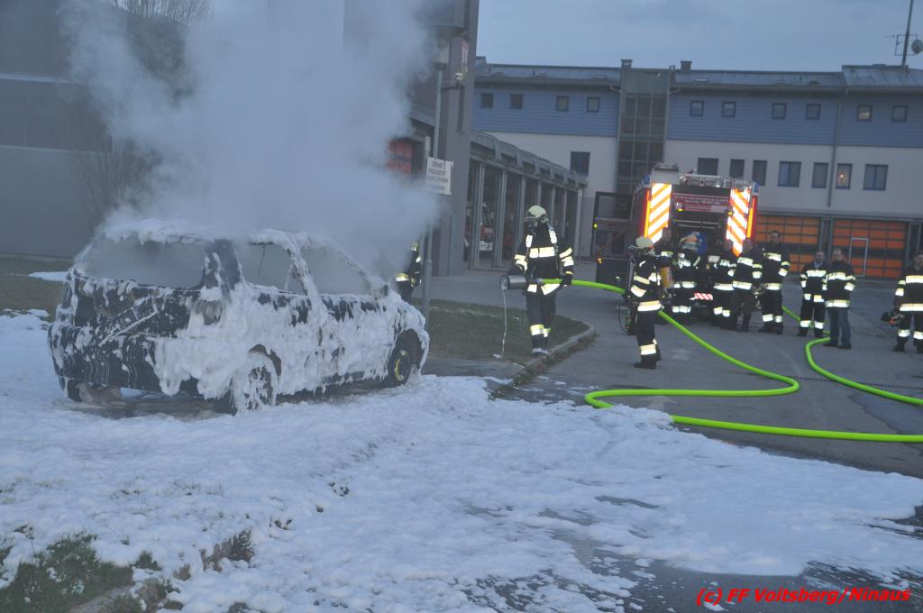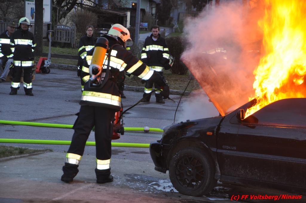 Der zweite Teil umfasste das Thema Autobrand. Bei einem solchen Brand kommt es zur Klassifizierung von vier Brandklassen (A,B,C und D). Speziell krebserregende Kunststoffe bei den Fahrzeugen führen immer mehr zu Problemen bei der Brandbekämpfung. Deswegen ist bei einem in Brand stehenden Fahrzeug ausschließlich der Brandangriff unter schwerem Atemschutz durchzuführen, erklärte Wehrkommandant HBI Ing. Klaus Gehr bei seinem Vortrag. Praktisch wurde mit einem neuen Löschgerät (tragbarer Feuerlöscher "Poly Portex SL 10") dessen effiziente und schnelle Wirkung bei solchen Einsätzen gezeigt. Mit dem HLF 3 Tunnel wurde letztlich ein erfolgreicher Löschangriff mit Schaum beübt.